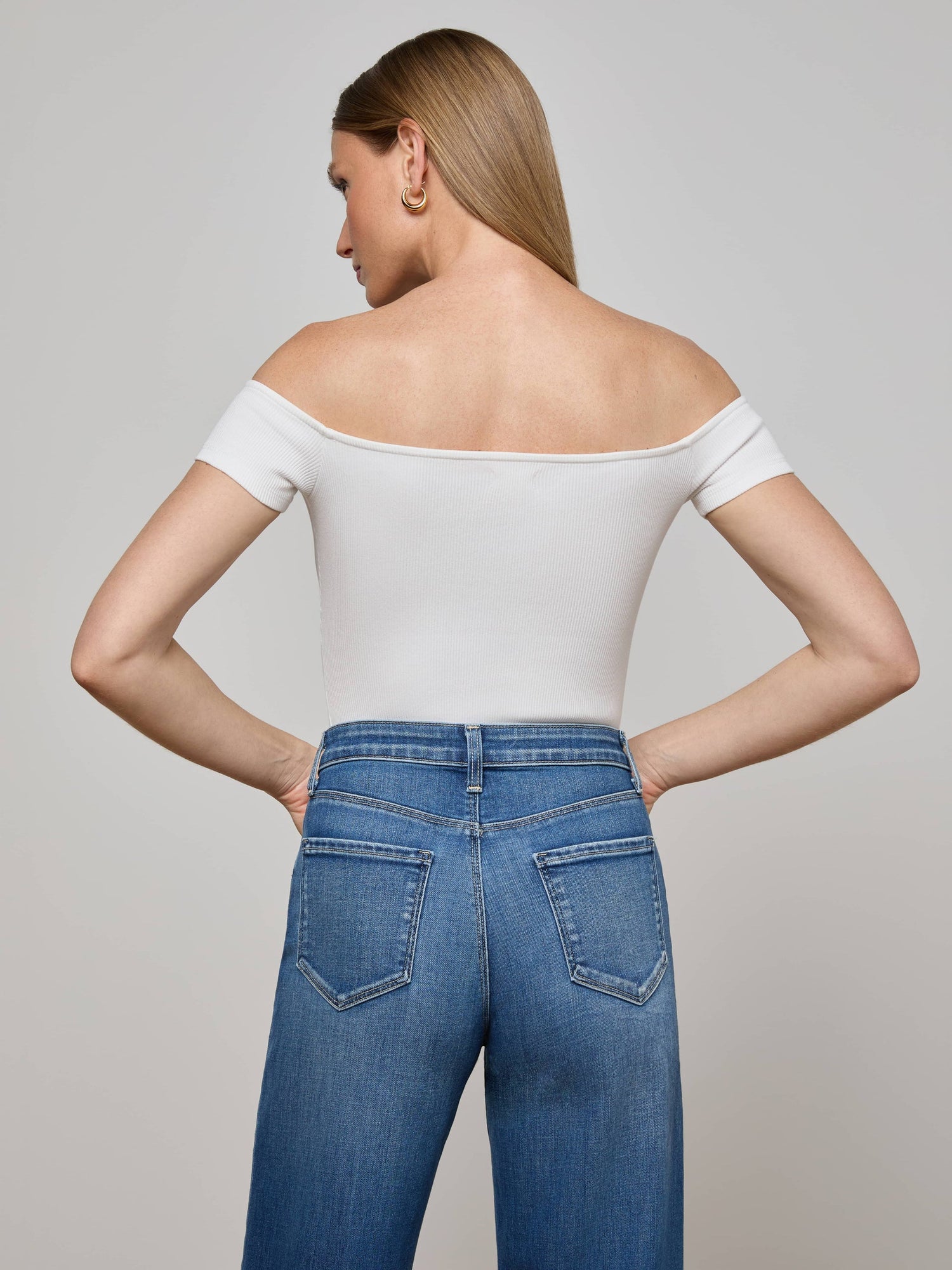 A flattering, form-fitting bodysuit with a romantic off-the-shoulder silhouette, constructed from a stretch rib fabric with high recovery.