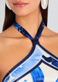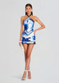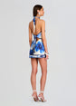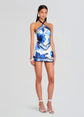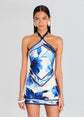 Introducing Retrofete's Adelaide Dress, featuring a captivating halter neck and alluring open back design. Embrace the essence of paradise with this stunning piece that seamlessly combines elegance and allure. Crafted with silk fabric and adorned with a vibrant tropical print, this mini dress evokes the spirit of summer in every detail. The halter neck adds a touch of sophistication, while the open back design exudes effortless charm, making this dress perfect for sun-soaked days and balmy nights. Shown here in Azure Primavera.