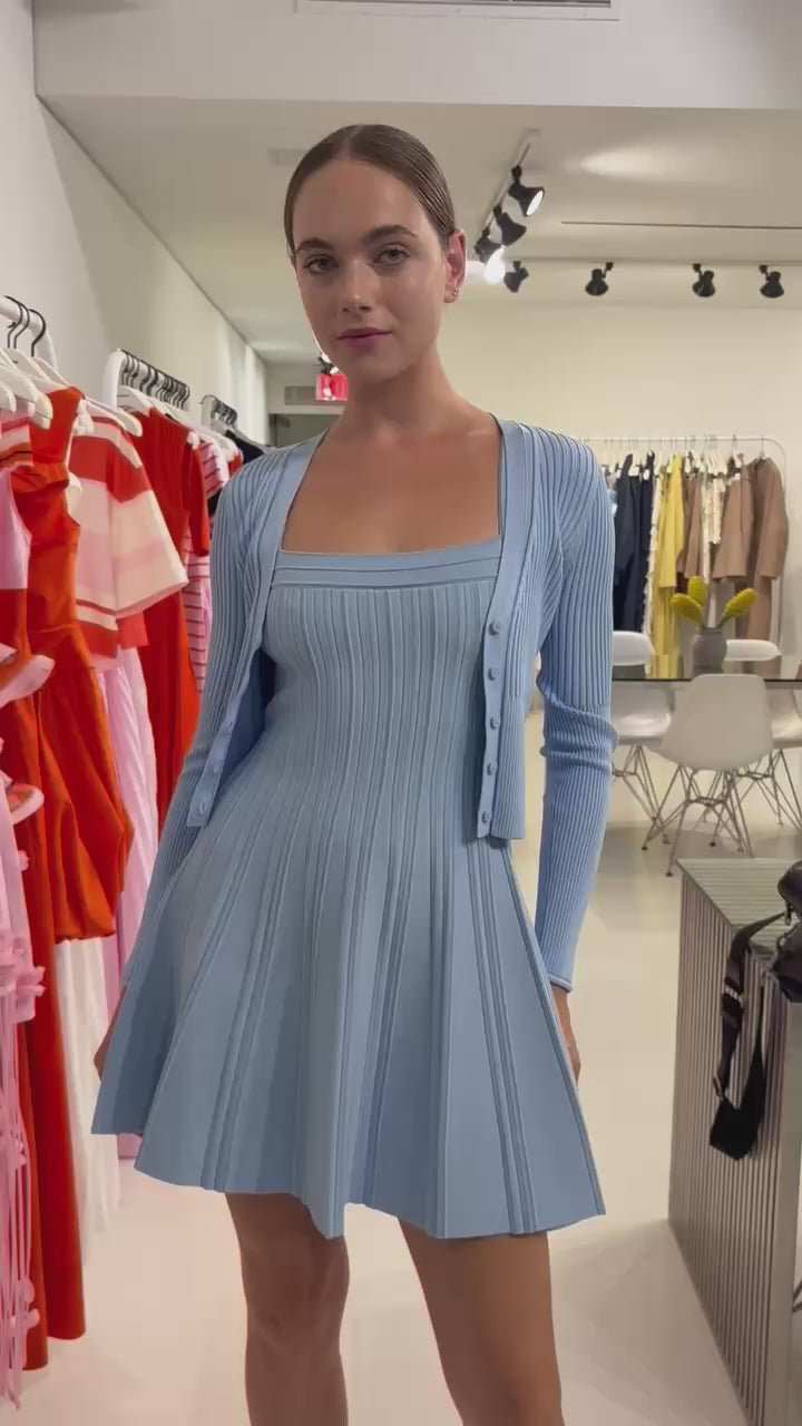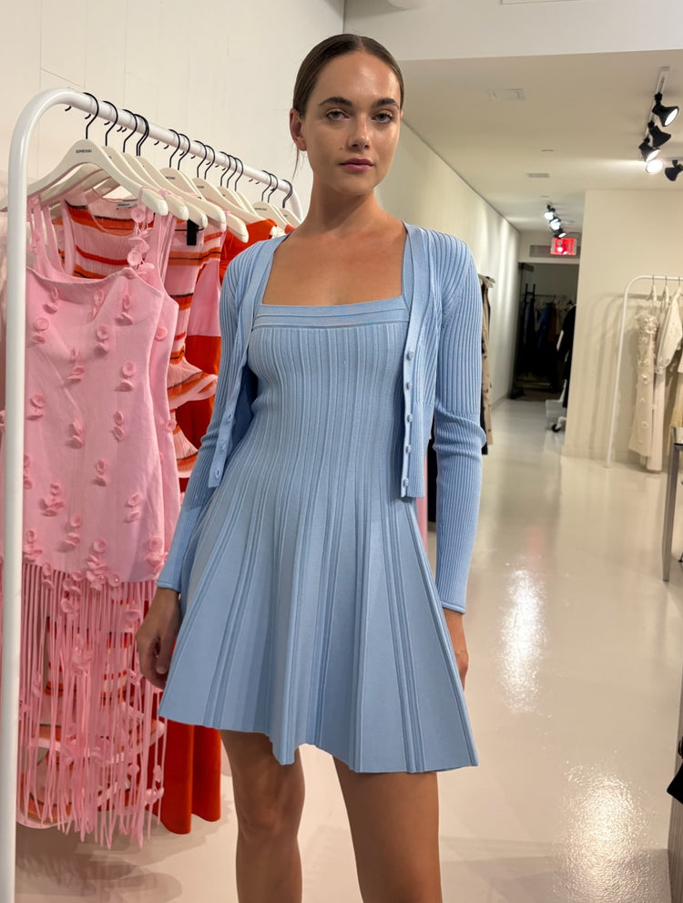 The Ailany Knit Cardigan in Tidepool. Crafted in compact rib knit, this fitted shrunken cardigan features a streamlined silhouette with button-front detailing. Its cropped length makes it an ideal partner to high-waisted trousers, creating a harmonious balance between cozy and chic.