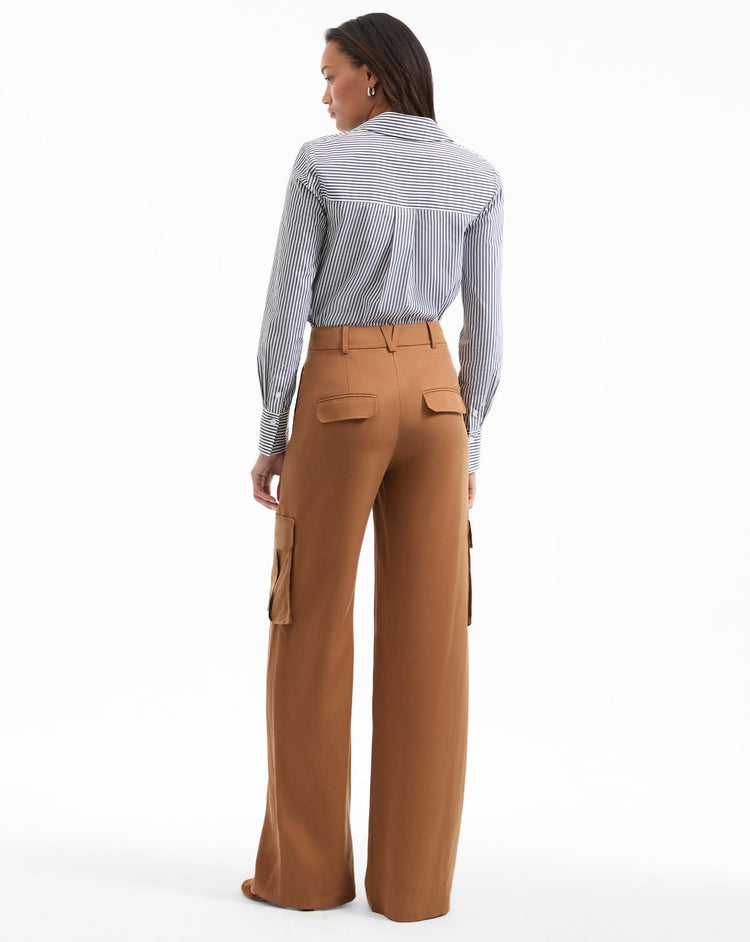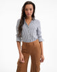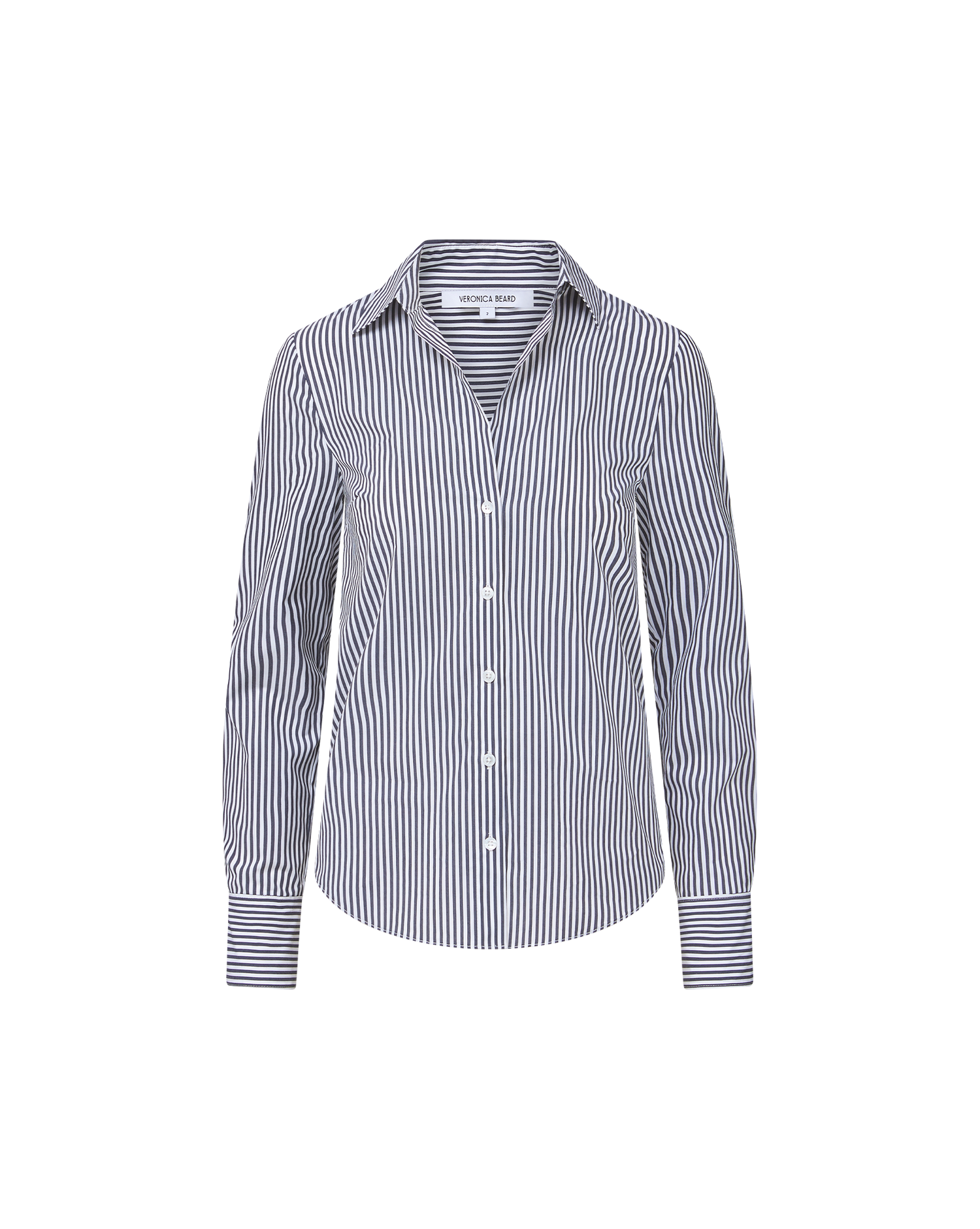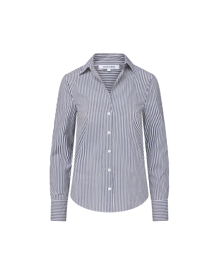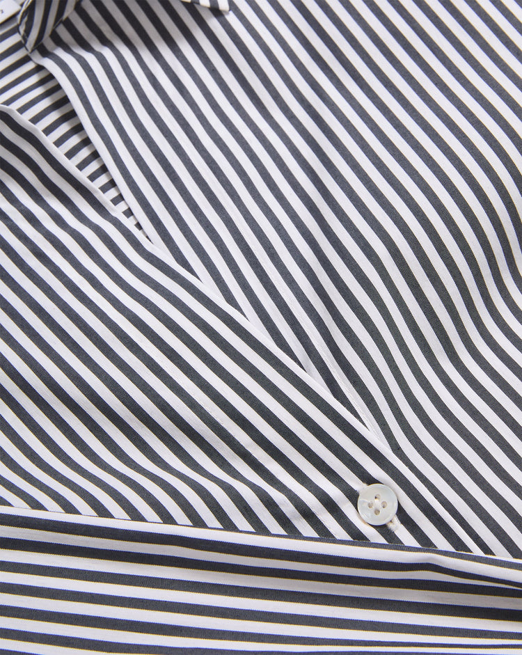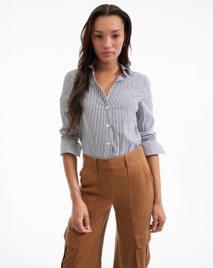 A classic button-down shirt never goes out of style. Expertly tailored from crisp cotton poplin—with stretch for ease—the Amelia white and navy striped shirt features a trim collar, wide barrel cuffs, and a curved hemline. Consider this a timeless addition to your wardrobe that you can pair with anything and everything.