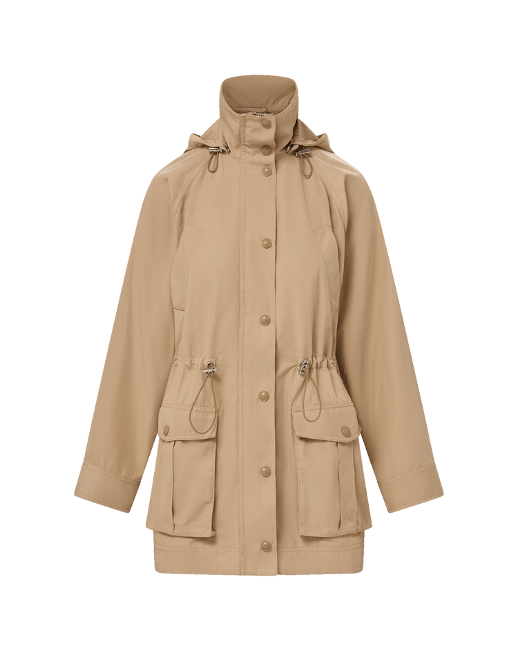 Designed to weather it all, the Arnault in cool beige offers a refined take on utilitarian outerwear. Crafted from water-repellent taffeta with a techy hand feel, it features a funnel neckline, welt chest pockets, and flap cargo pockets—plus adjustable drawstrings at the waist and a removable hood for a tailored fit. A hidden zipper and snap-button placket provide a sleek finish. Functional yet polished, it’s your new go-to layer—rain or shine.
