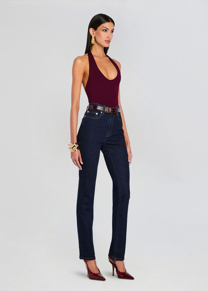 The Bamboo Halter Bodysuit by Sans Faff is pictured here in Bordeaux.