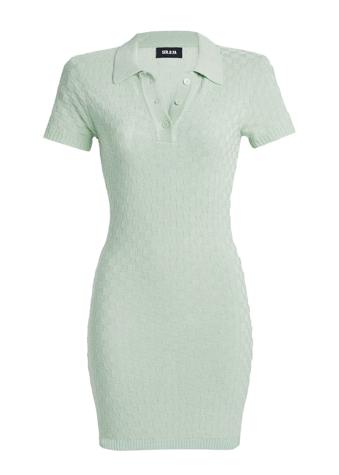 Knit, polo style mini dress with subtle checkered detailing. Shown here in Frosted Sea.
