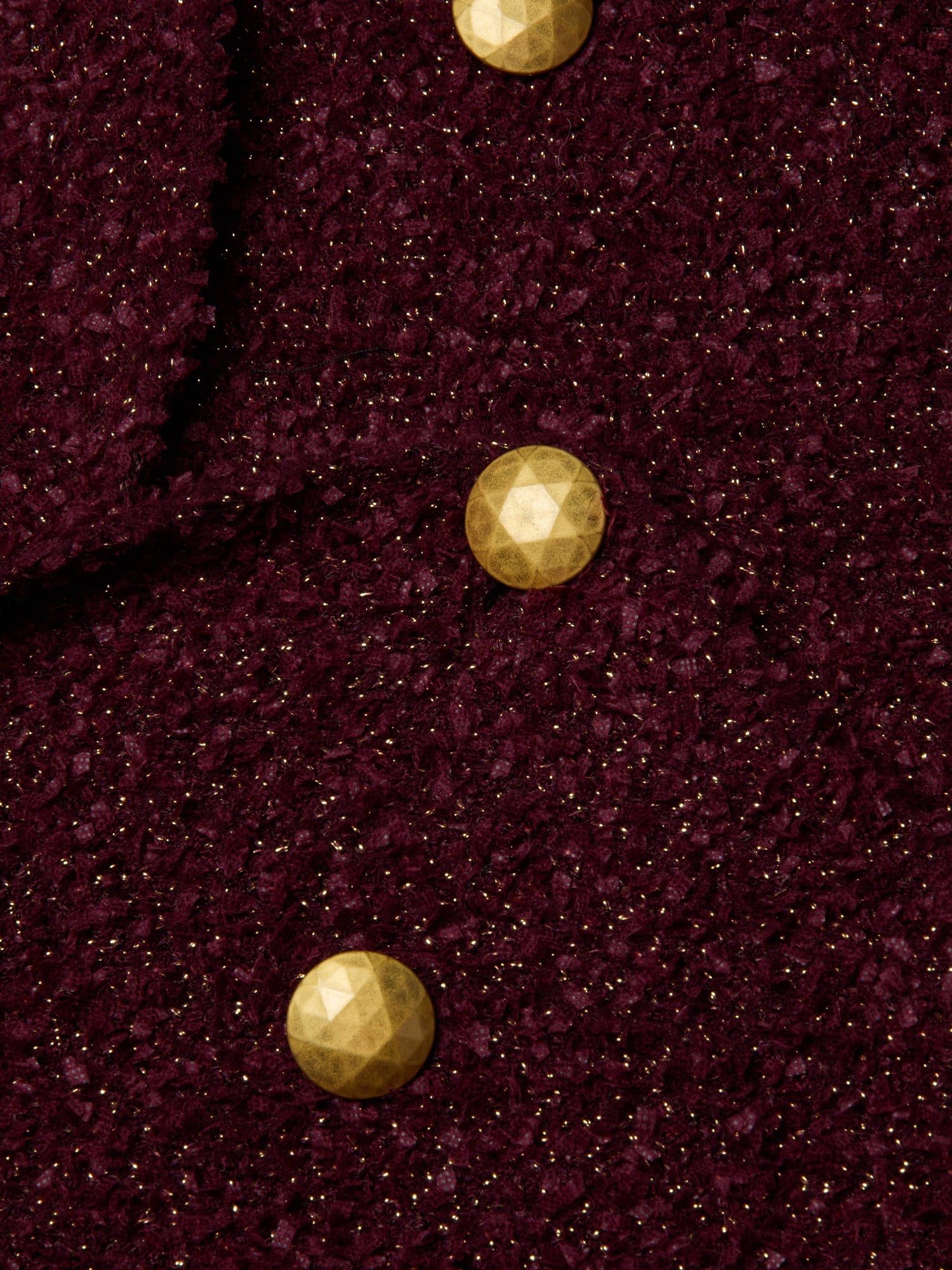 L'AGENCE's most figure-flattering blazer. The Bethany features a super sculpted silhouette with a nipped waist and flared hem. Now in an ultra-wearable dark port knit with a subtle sparkle.