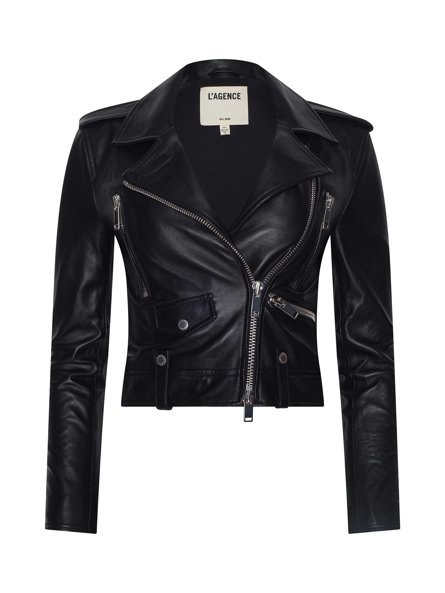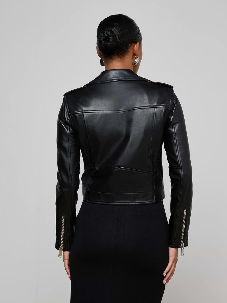 A feminine take on the moto-style leather jacket, crafted in 100% premium lambskin leather. The Biker features metal snaps at the lapel, zipper details at the sleeves, slimming panel construction along the back, and an off-center two-way zipper closure. Fully lined.