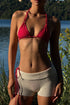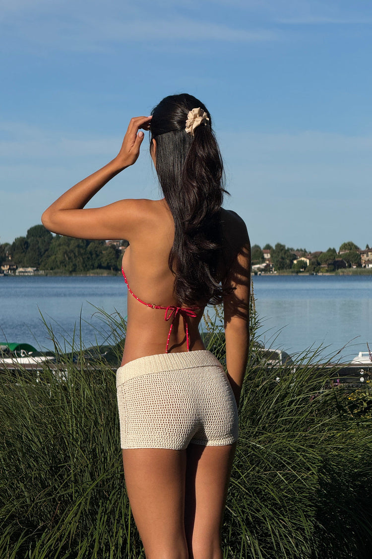 Bo shorts in Ivory. Add a tactile detail with the Bo hand-crocheted shorts. Made from stretchy, spandex yarn, the elasticated waistband hugs without squeezing. Rachelle is wearing size S.