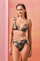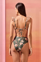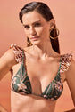 A playful twist on the classic triangle bikini, this top features a lush floral print on a deep green backdrop, accented by ruffled straps in a bold leafs pattern. The mix of prints adds a touch of wild elegance, perfect for sun-drenched days on the sands of Copacabana. Made for tanning, lounging, and diving into the spirit of summer.
