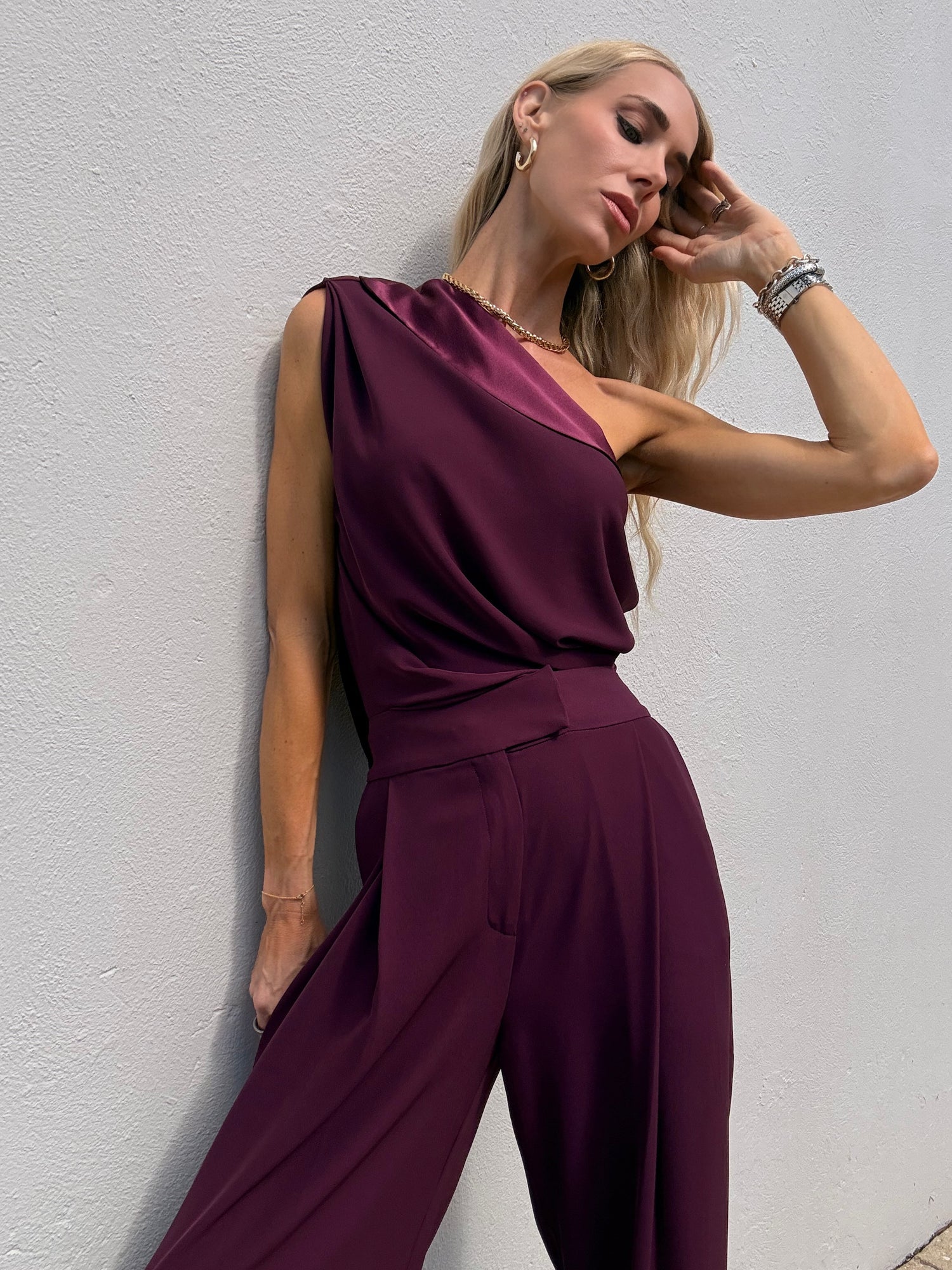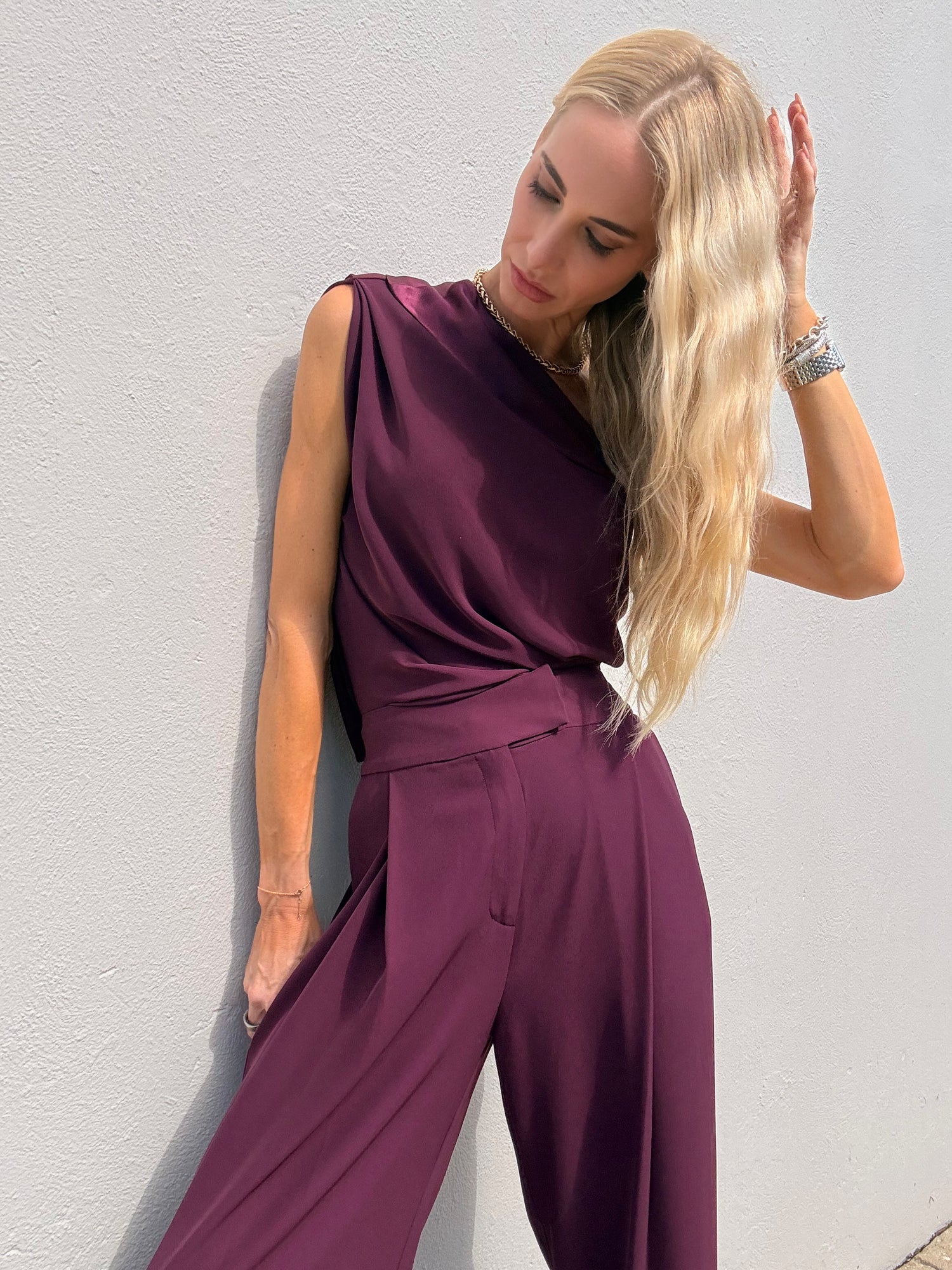 The Boyfriend Trouser by The Sei is pictured here in Merlot. More info coming soon.