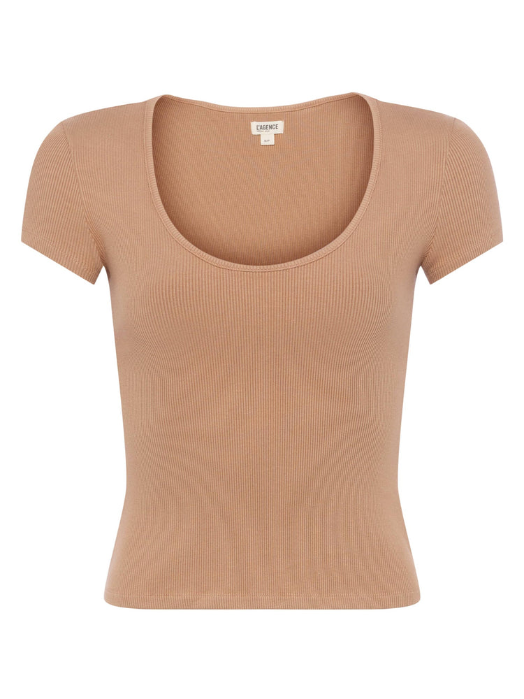 A must-have ribbed tee featuring a flattering scoop neck and a sleek, close fit. Made from a high recovery stretch cotton-modal blend, it's your go-to base layer for any look.