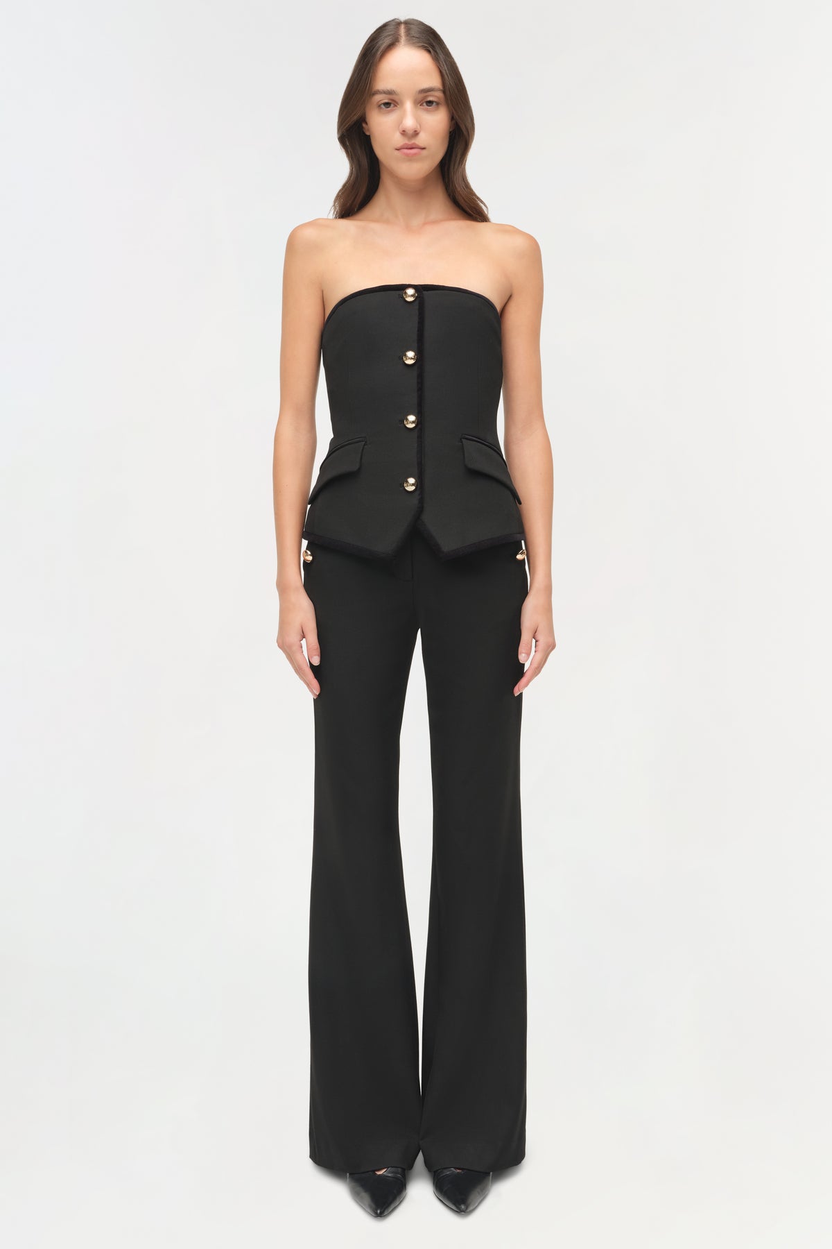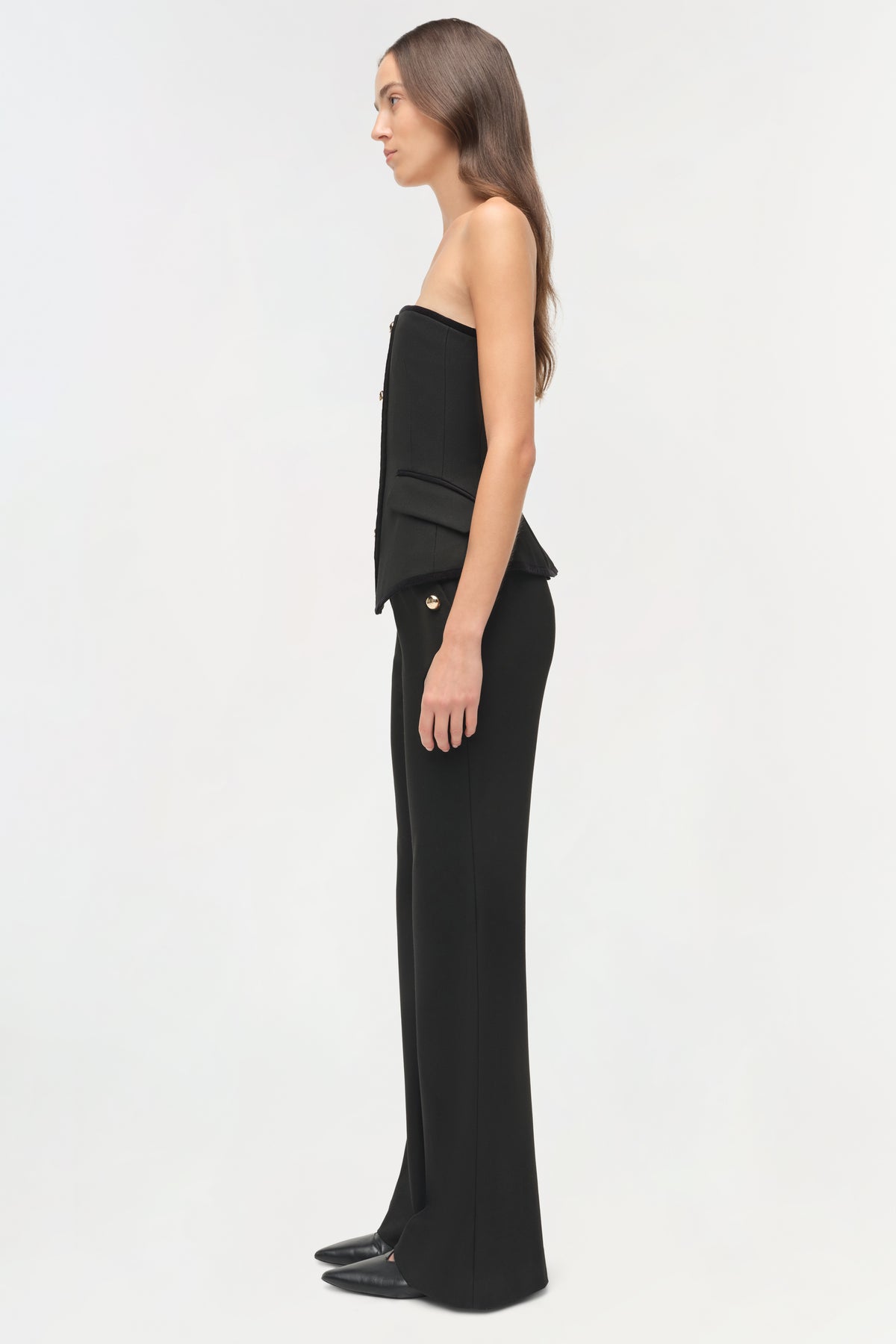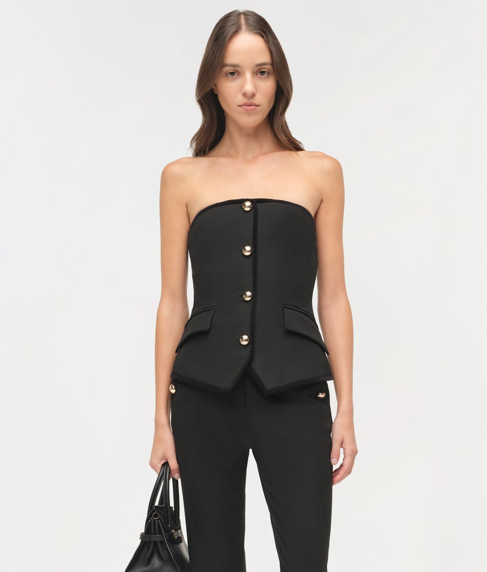 Framed in velvet and cut to sculpt, this strapless bustier merges structured form with decadent detailing. Gilded buttons accentuate the structured front, while sharp pocket flaps add a tailored edge.
