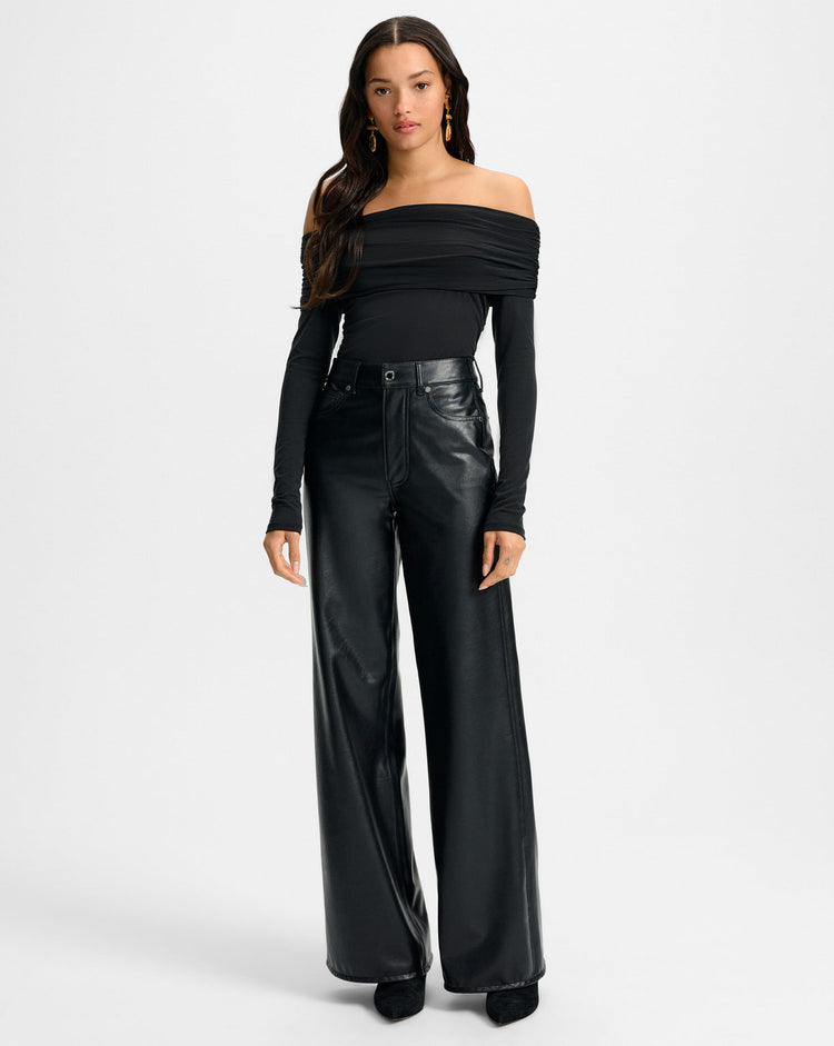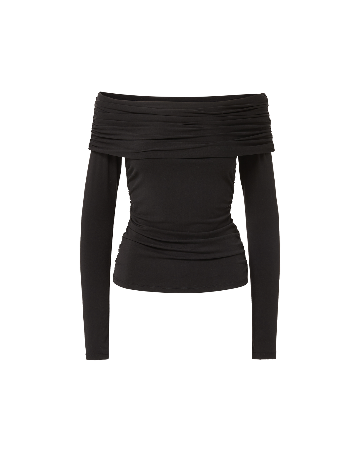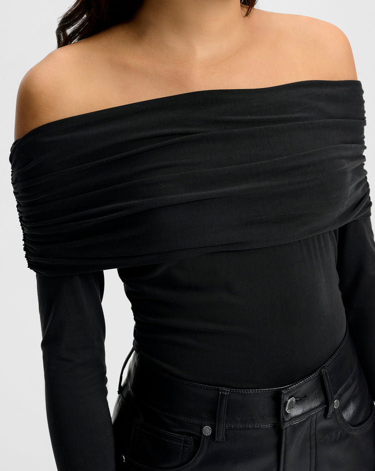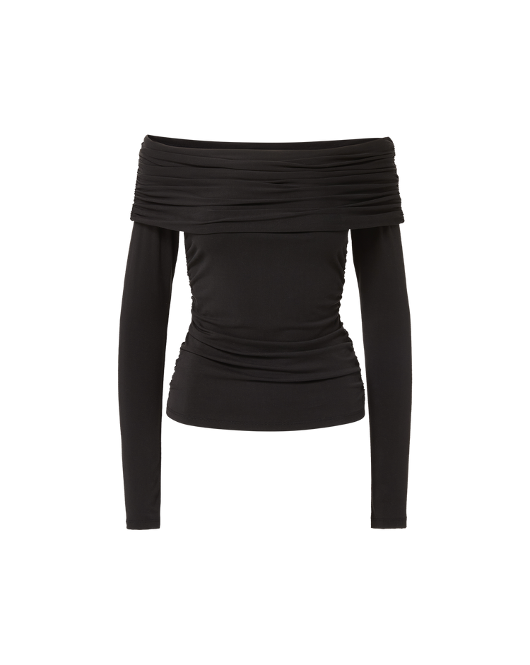 A sleek, sculpted top with AM-to-PM versatility. Crafted from a premium stretch-jersey blend in black, the Chaiya long-sleeve top is cut for a slim, body-hugging fit. Its off-the-shoulder neckline features a softly gathered foldover detail for a look that’s polished yet undone. Perfect for daytime and date nights, pair it with everything from casual denim to tailored trousers, fluttery skirts, and more.