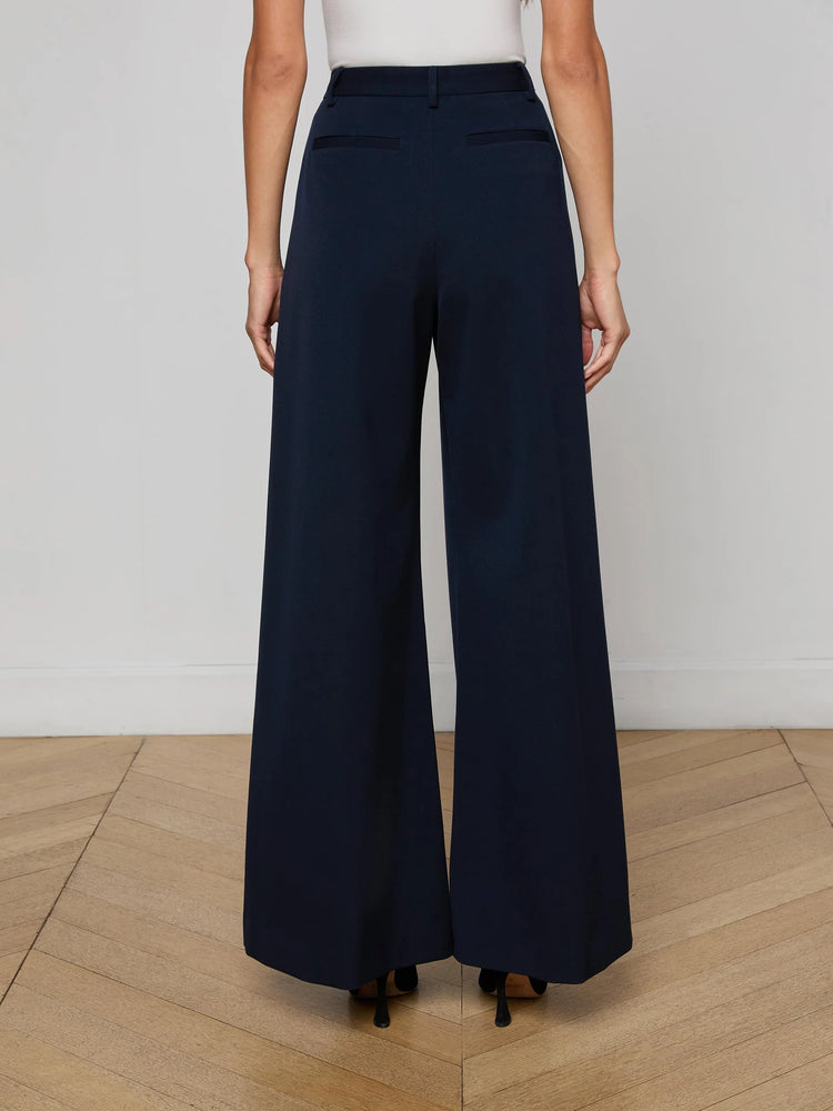 The Chelsy pant is a striking study in fluid tailoring, defined by its dramatic wide leg and sharp front pleats. Cut to sit high on the waist, it elongates the silhouette while moving with ease and elegance. Pair with a sleek blazer or let it flow against a fitted knit for a refined contrast. Now in midnight navy.