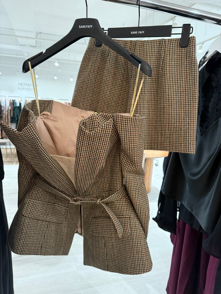 The Cosette Skort by Sans Faff is pictured here in Houndstooth. More info and images coming soon.