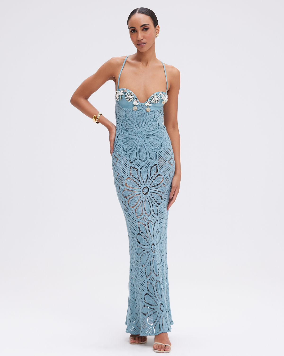 Part of the Camila Coelho X PatBO Collection, this maxi dress features a fully hand embroidered crochet design with shell and beading detail along the neckline into a built in bodysuit for lining along the bodice and a fully sheer skirt. Back cut out detail and clasp closure.