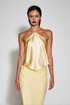 Halter silk charmeuse top features cross strap detail at the neck.