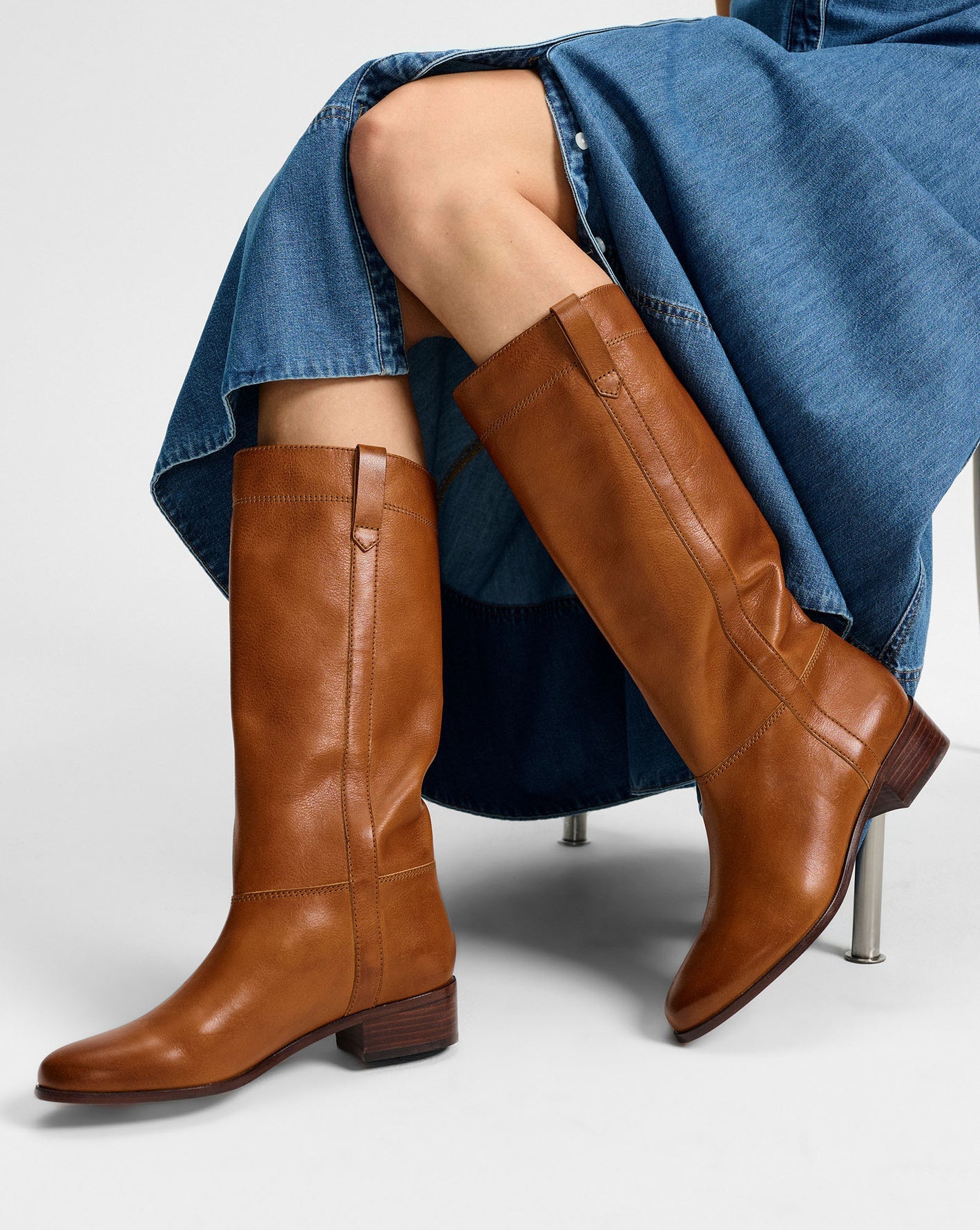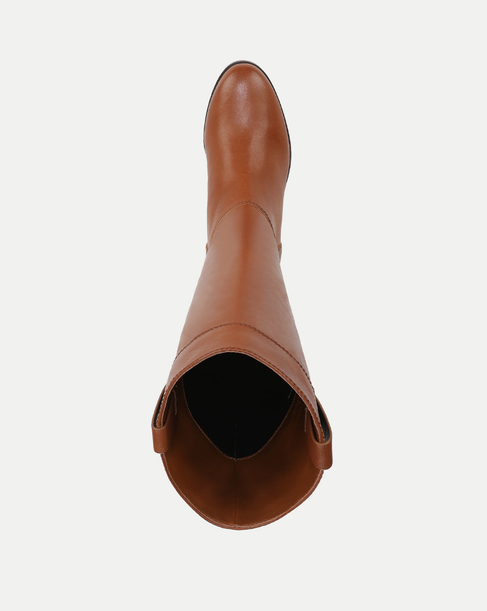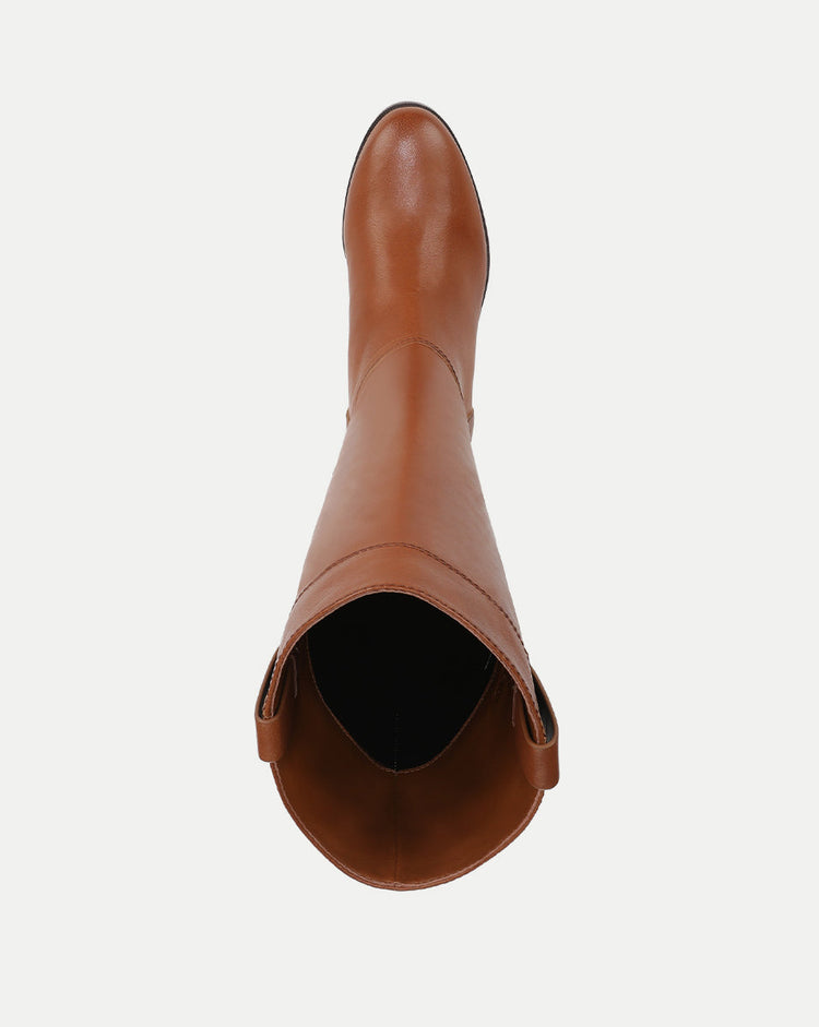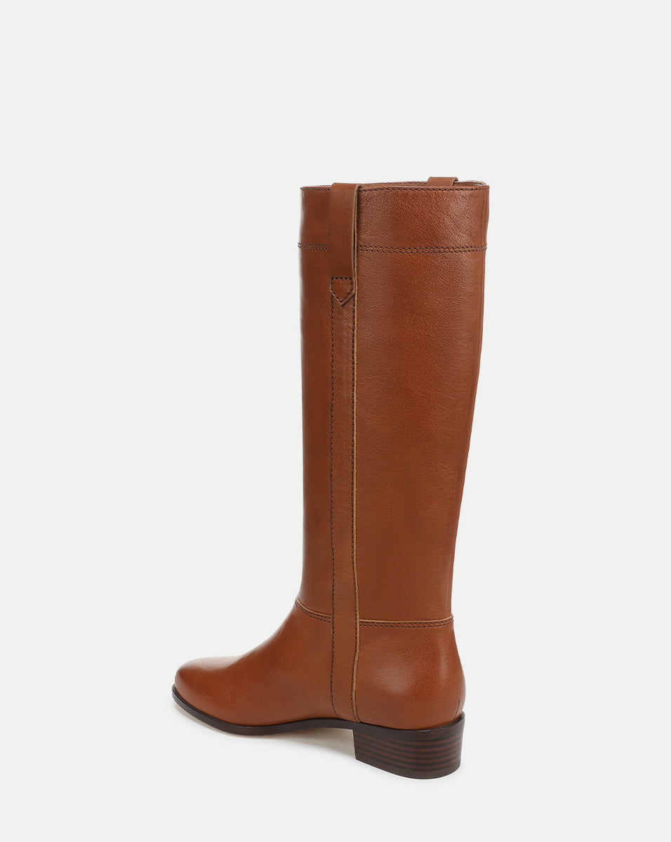 The boot every closet needs. The Dwyer is a classic riding boot with a softly rounded toe and sleek, minimalist silhouette. Designed for easy pull-on styling, it features side pull tabs and a tall, subtly asymmetrical shaft—a nod to its equestrian roots. A two-inch stacked heel completes the look, adding subtle lift. Endlessly versatile, these tan leather boots pair seamlessly with skirts and dresses or over slim-leg denim.