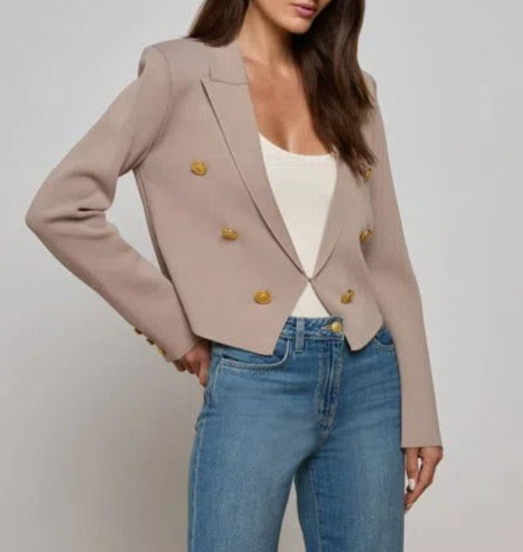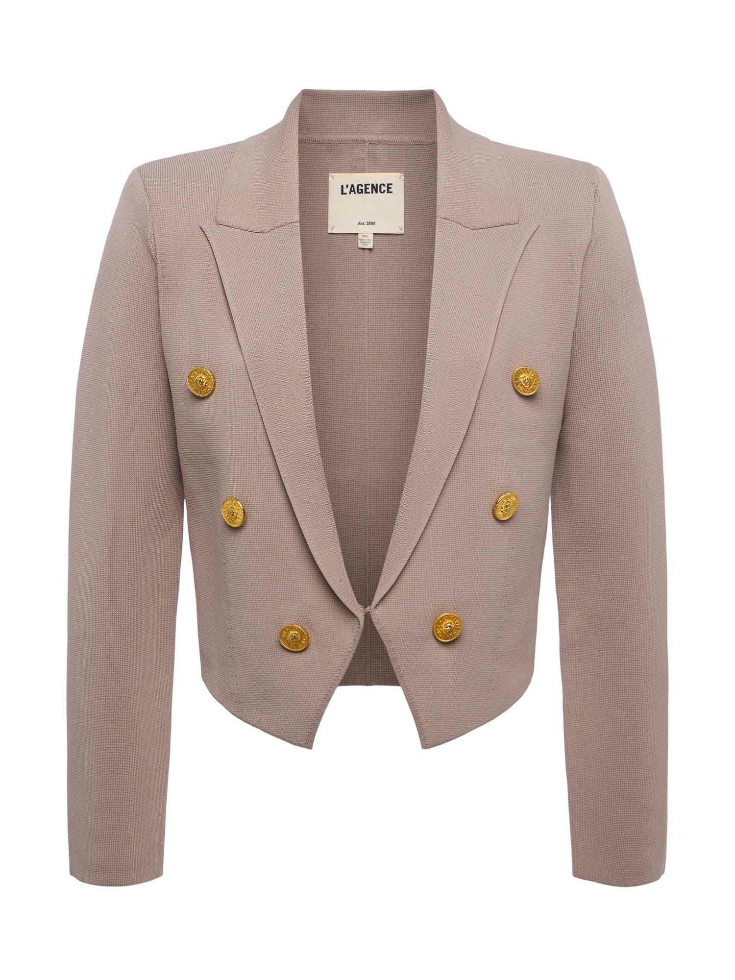 The Elio Crop Knit Blazer by L'AGENCE pictured here in Pale Khaki. More info coming soon.