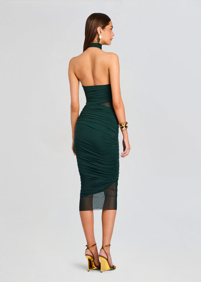 Bodycon midi dress with high, halter neckline. Ruching and sheer paneling throughout bodice. Shown here in Evergreen.