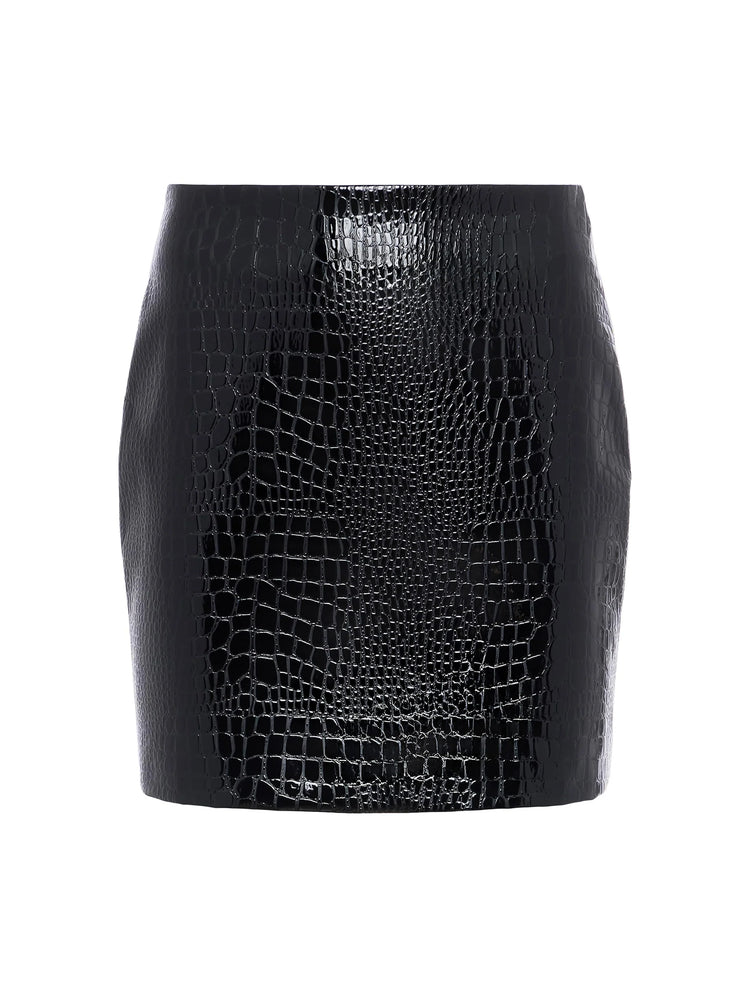 Sleek and undeniably cool, the Gerard mini skirt is crafted from high-shine, croc-embossed vegan leather for instant downtown edge. Its body-skimming silhouette adds polish, while the bold texture makes it a standout staple. Pair it with a slouchy knit for contrast, a sharp blazer for night-out glam, or double down on the attitude with a moto jacket and boots.