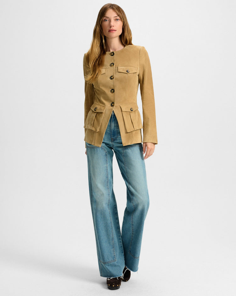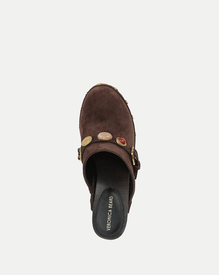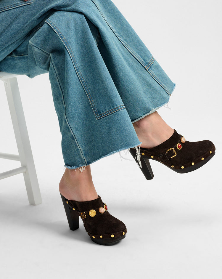 An elevated take on the classic clog—literally. The Giana is a heeled, mule-style clog crafted from premium brown suede. Designed for dramatic height, it features a four-inch cone-shaped block heel and a one-inch platform. The look is finished with a belted vamp strap, embellished with boho-inspired cabochon stones and a VB crest charm, and gold studs along the base. Pair these standout platforms with everything from wide-leg VB denim to flowing maxi dresses.
