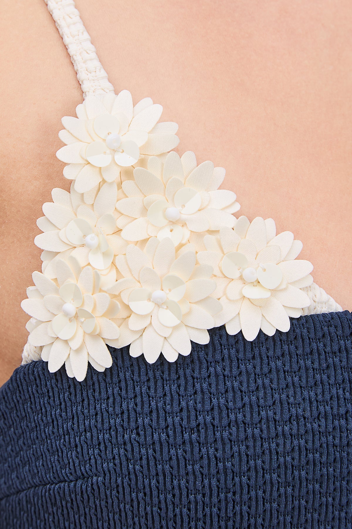 The Hayes is a mini dress with button detailing on the center front and hand-beaded flower detailing.