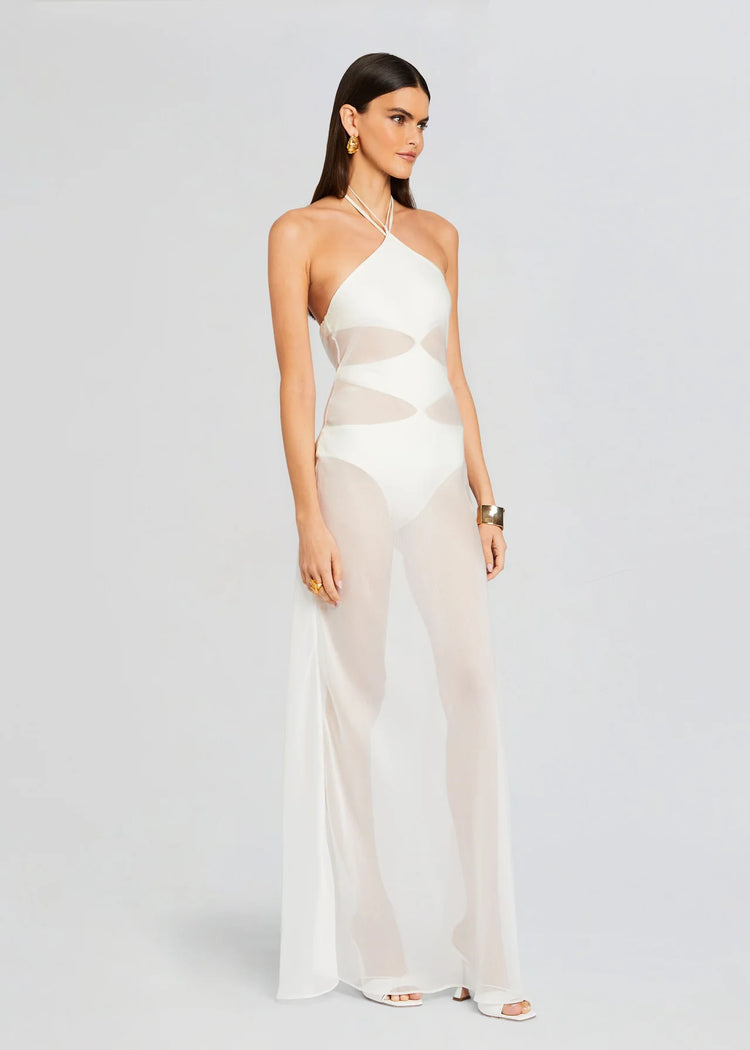 Whether you’re lounging by the shore or sipping cocktails at a beachside bar, Shani Shemer’s Heleny Dress has you covered. This captivating dress features sheer fabric that drapes delicately, offering both glamour and comfort in one stunning ensemble. Perfect for those sun-kissed days, this dress embodies breezy chic with its lightweight, sheer material that effortlessly captures the essence of the coastline. Shown here in Cream.