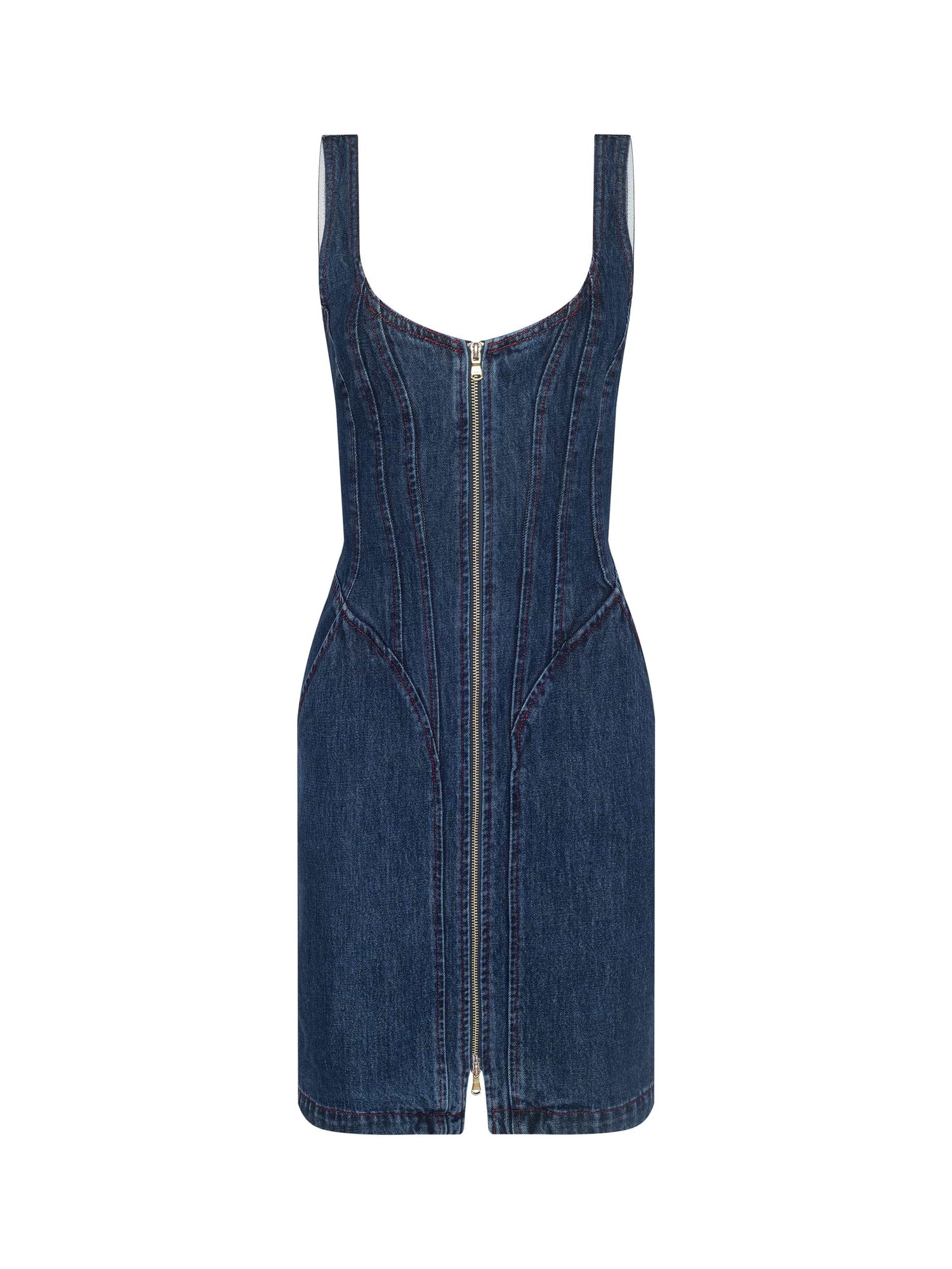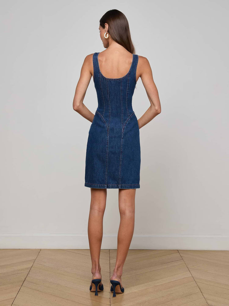 Meet your new new favorite mini dress. The Jaxyn is a corset-style mini dress featuring contoured seams and a bold front zip designed to define and flatter the figure. Now in indigo.