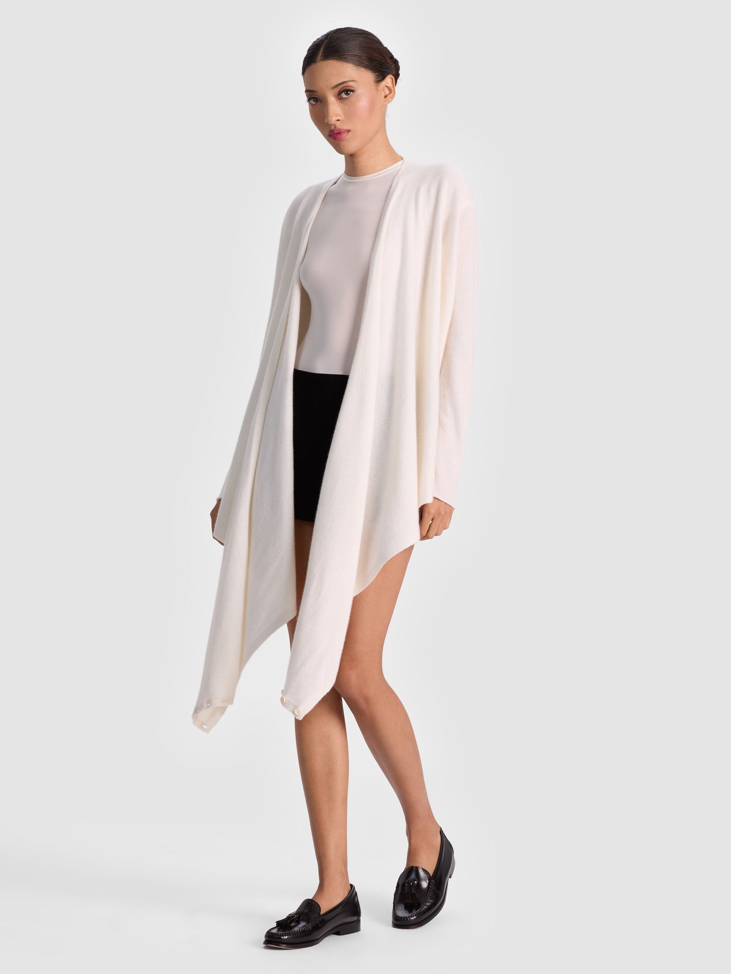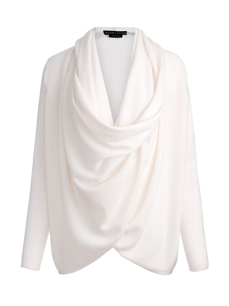 Alice + Olivia's cult-favorite Jules Pullover is back by popular demand! Spun from feather-soft, 100% pure cashmere, this gorgeous ecru sweater drapes fluidly to flatter every figure. Functional buttons at the neck let you style it in myriad ways-off the shoulder, as a cardigan, draped in front-you can’t go wrong. The curved hem skims the hips for a relaxed yet refined shape, making it effortless to half-tuck into denim or layer over slip skirts. Luxurious, timeless, and versatile-this is a forever favorite.