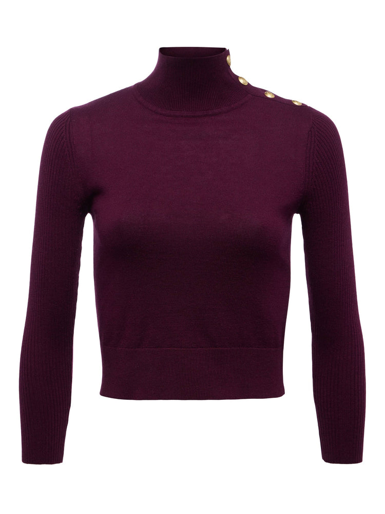 Functional snap buttons allow for the Kamdyn mock neck to be worn upright or folded over. Now back in dark port.