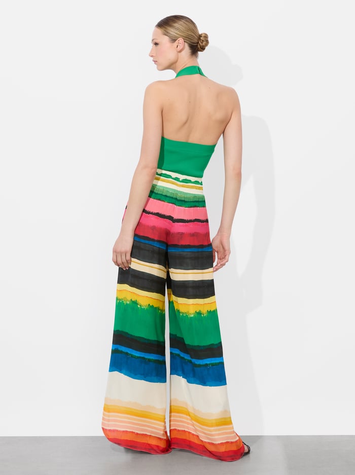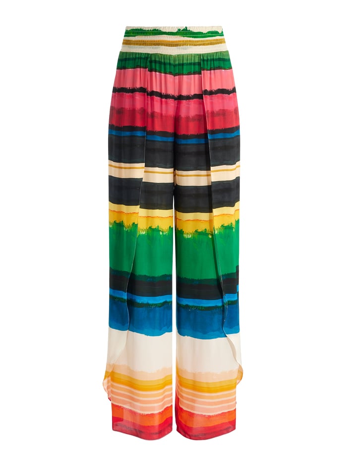 Soft, breezy, and unexpectedly sultry- these multicolor pants feature open front pleats that reveal the leg as you walk, creating an almost skirt-like effect. Crafted in Alice + Olivia's printed double viscose, they sit high on the waist with a smocked band that’s as comfy as it is flattering. Easy to pack, effortless to style- your new vacay essential.