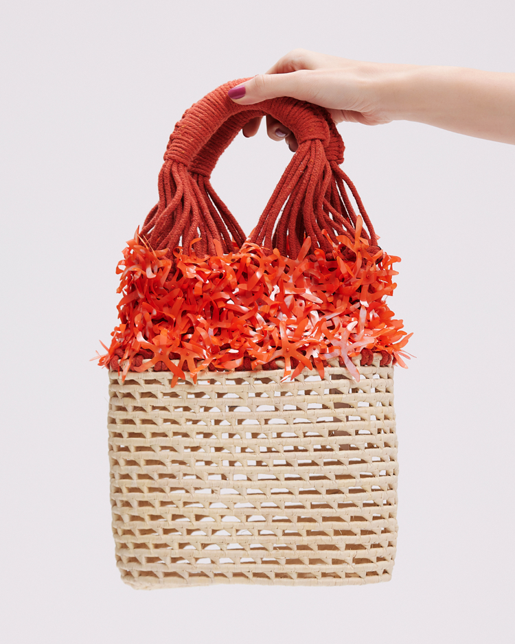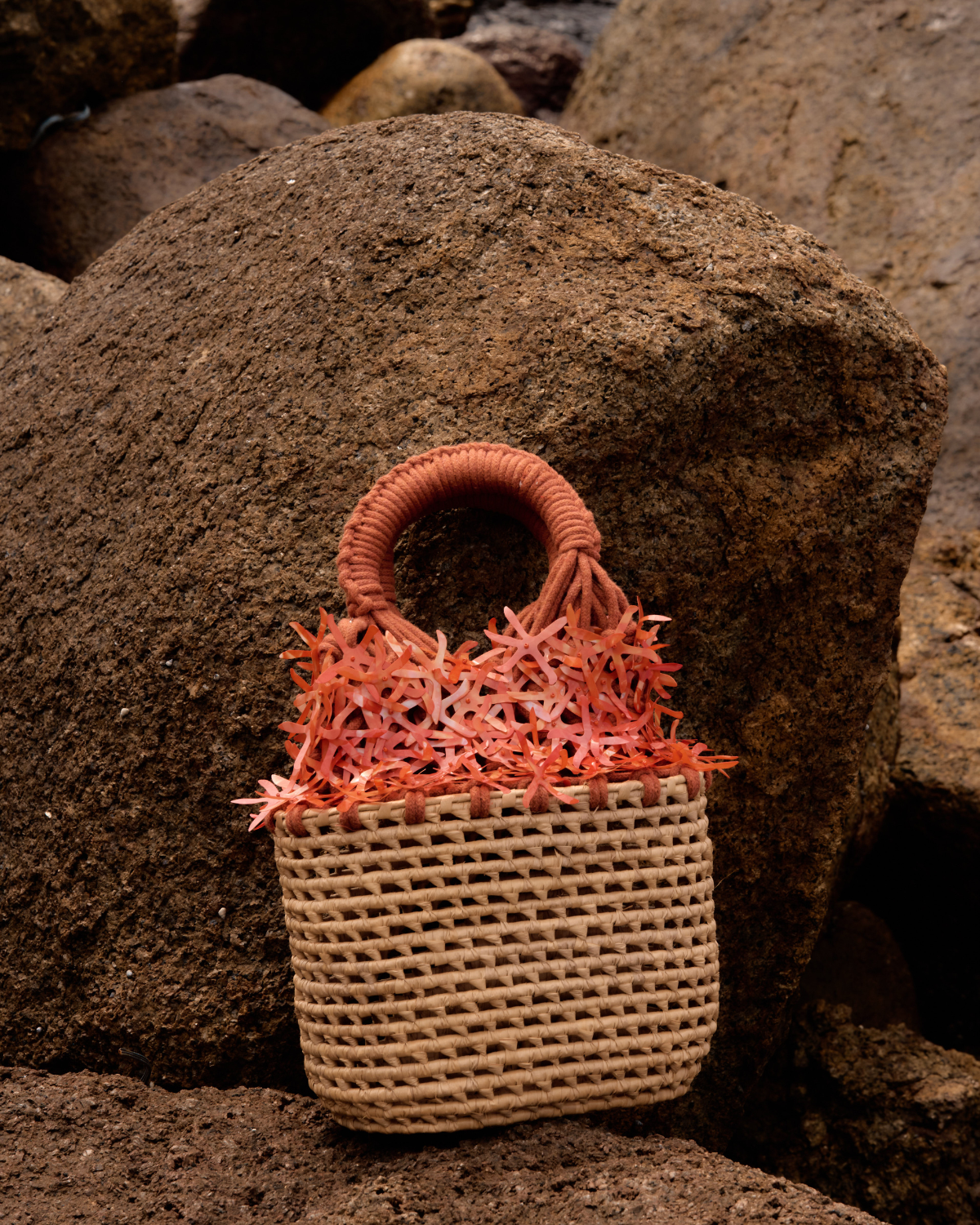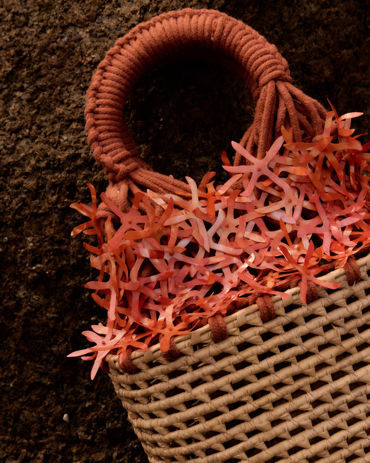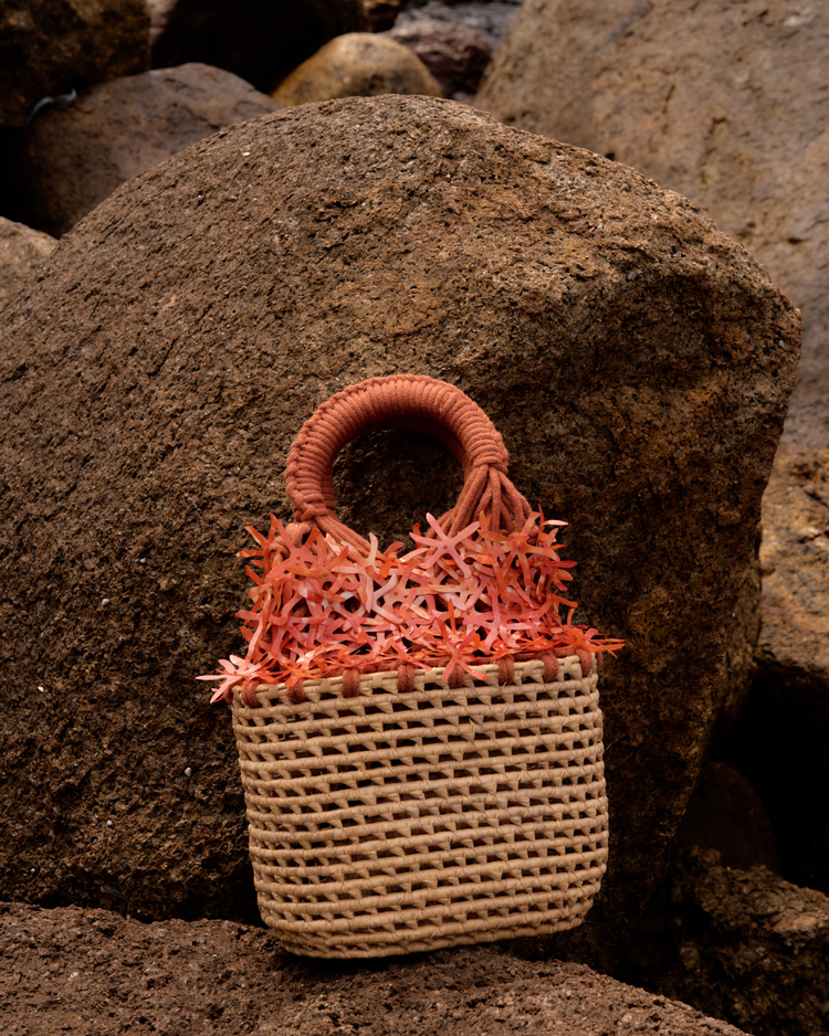The Nannacay Lis Bag showcases a beautifully structured, handwoven basket-like base, in a medium-sized design with an intricately woven top enhanced by vibrant coral appliqués, adding a pop of color and a fully woven handle making it an ideal accessory for any occasion.