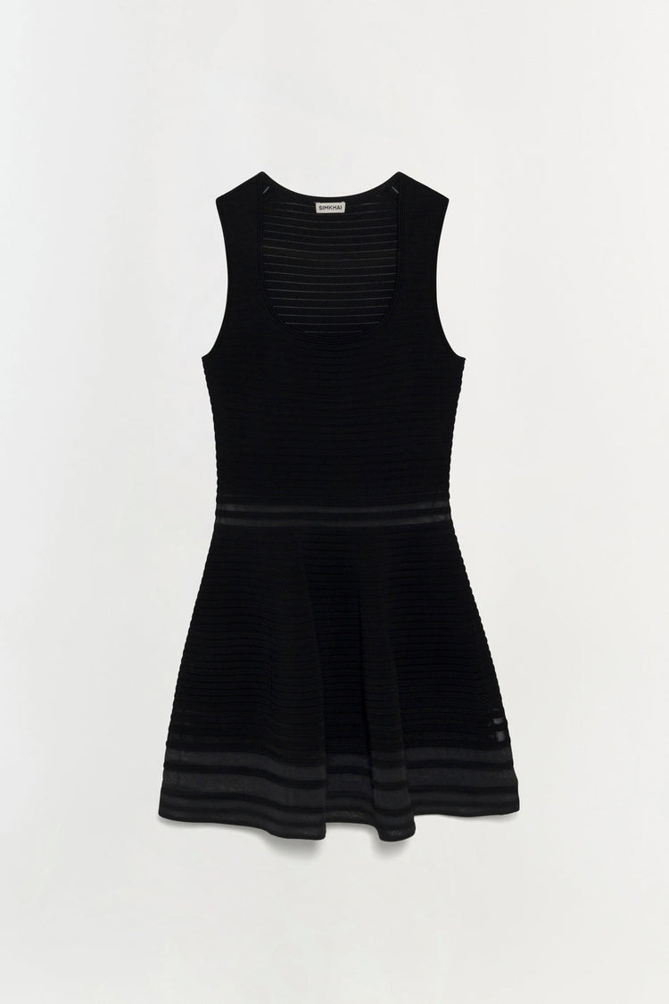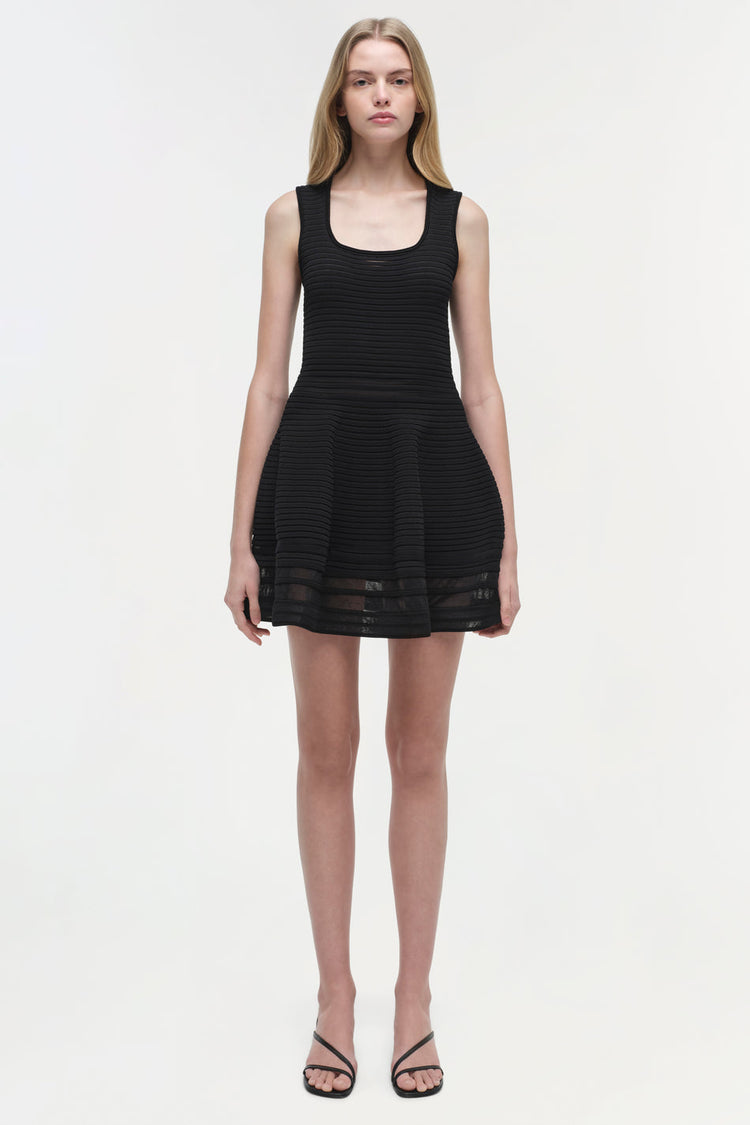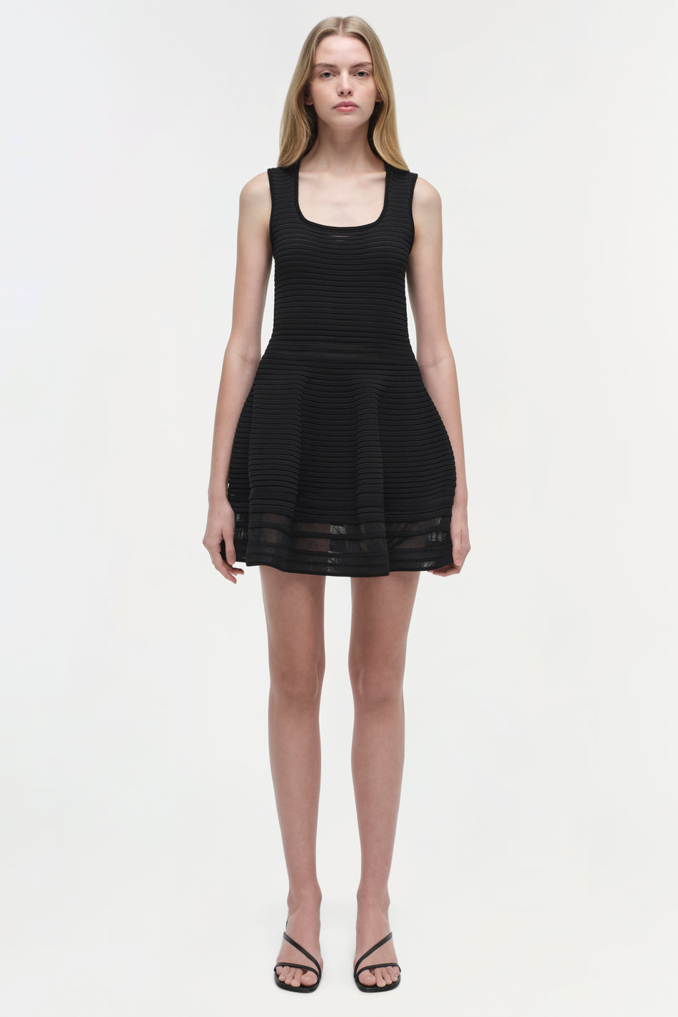 A sleeveless mini dress engineered from illusion knit with layered opaque and sheer striping that holds its calculated shape.