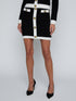 The Lottie skirt channels effortless femininity with bold contrast and tailored ease. Crafted in a plush knit, its sleek silhouette is framed by ivory trims and punctuated with embossed gold buttons. Pair with its coordinating cardigan for a sophisticated set.