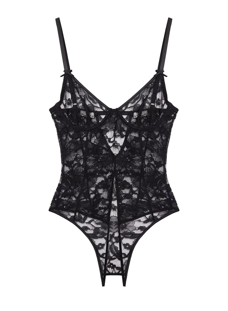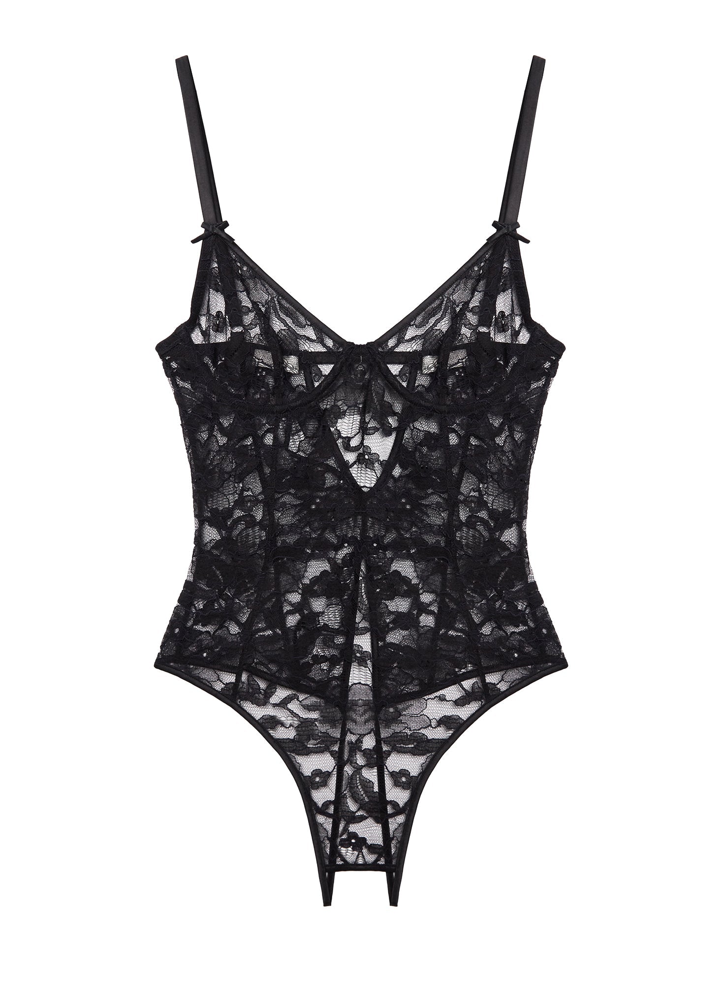 Seriously sexy. Fleur Du Mal's Magnolia Lace Ouvert Bodysuit in stunning stretch French Leavers lace. Features underwire cups for support, plus adjustable straps for a customized fit. Crotchless with open back. Pair with thigh highs for an unforgettable after dark look.