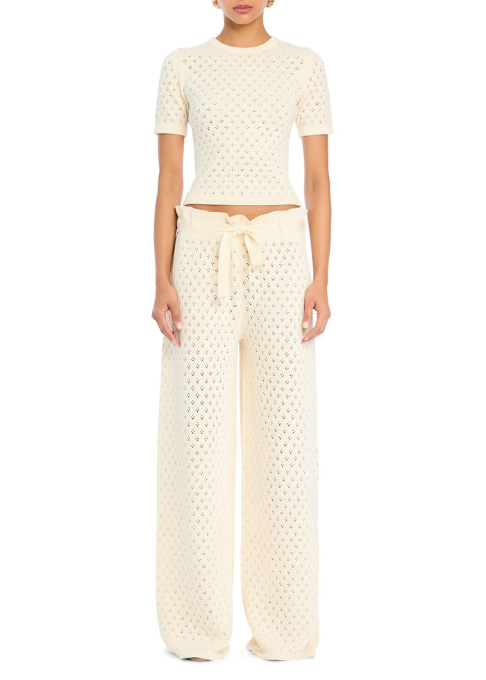 Pointelle knit wide leg pant with drawstring detail at waist. Pair with the Josie Knit Top. Shown here in Eggshell.