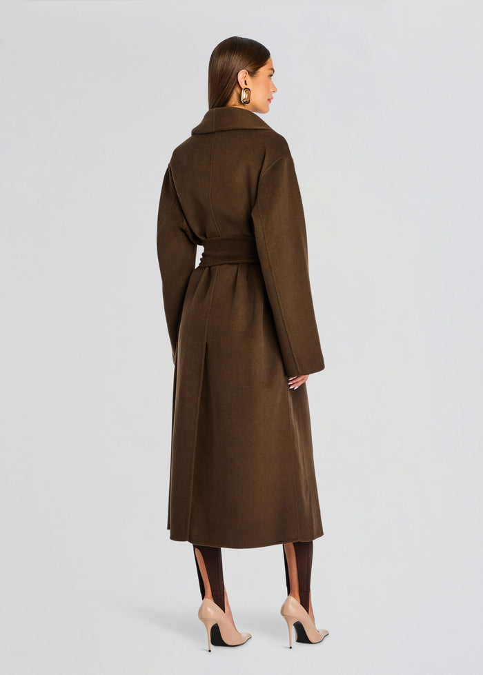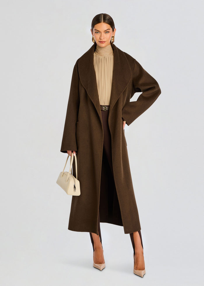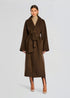 Open front wool blend coat with a relaxed collar. Front patch pockets and a removable belt at the waist.