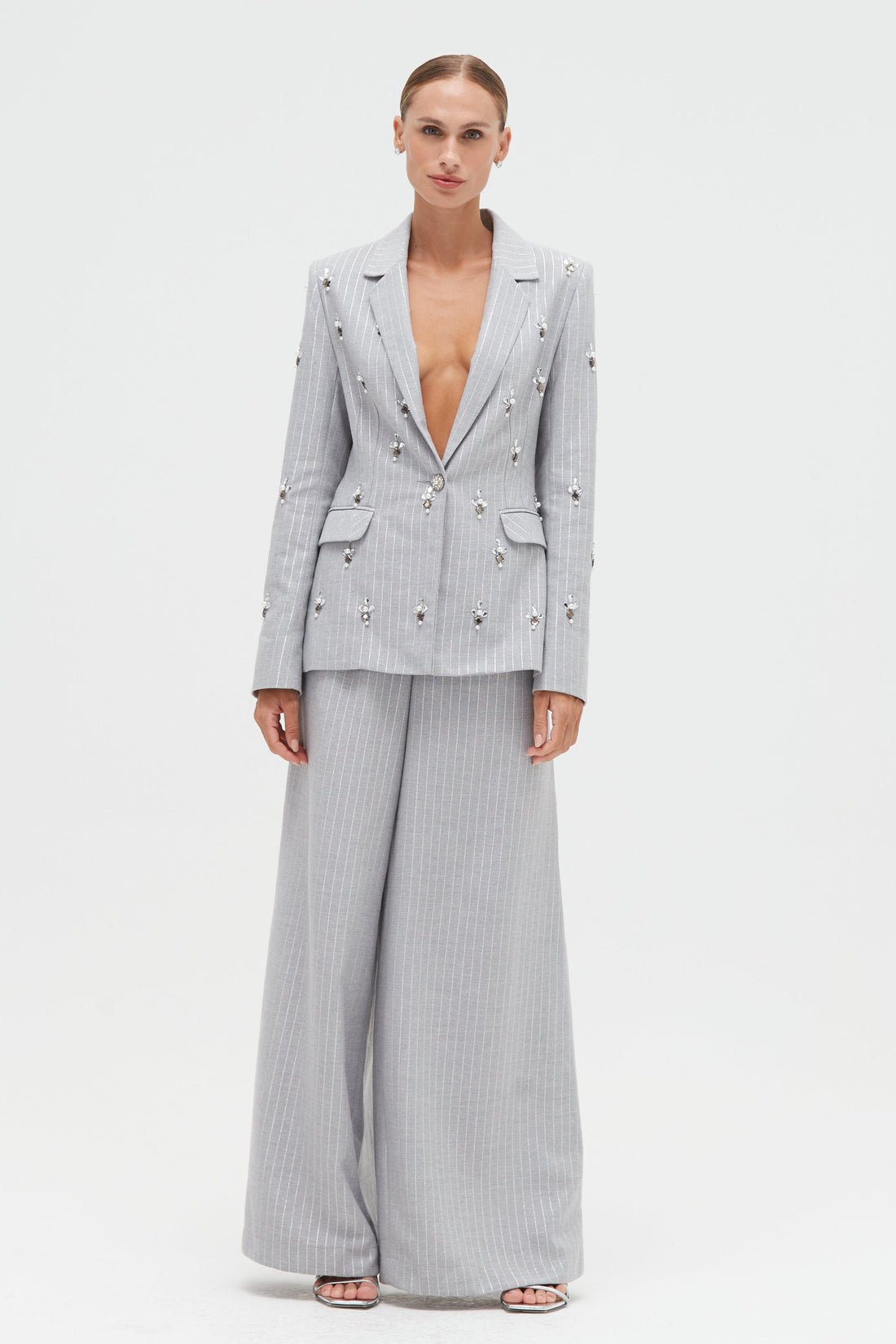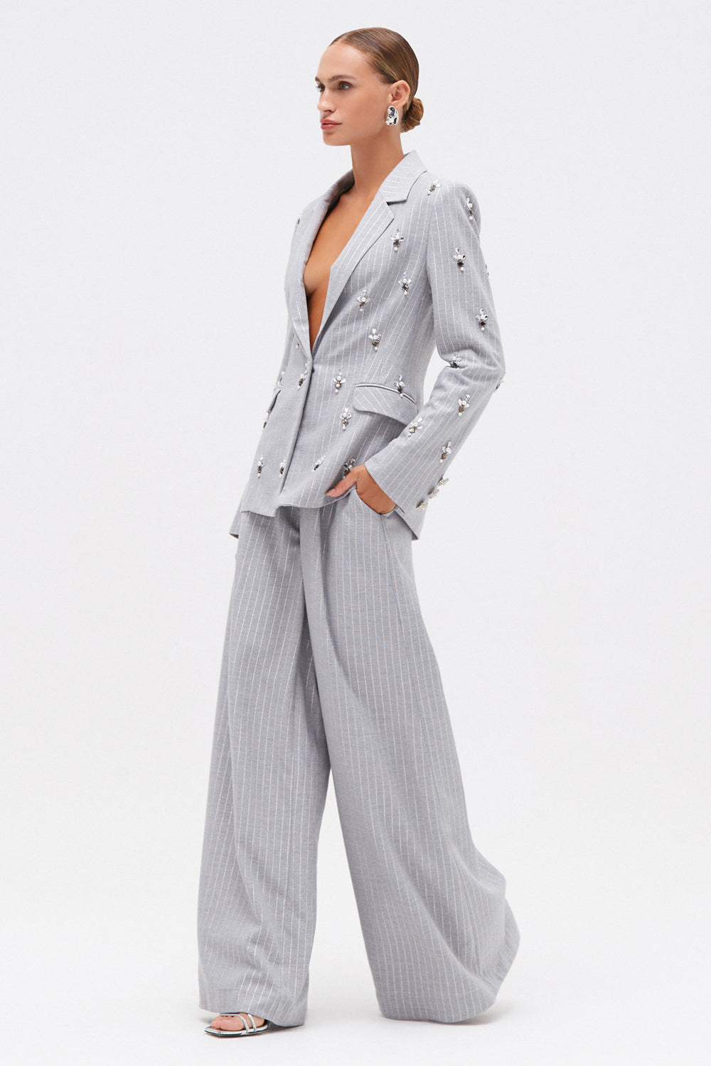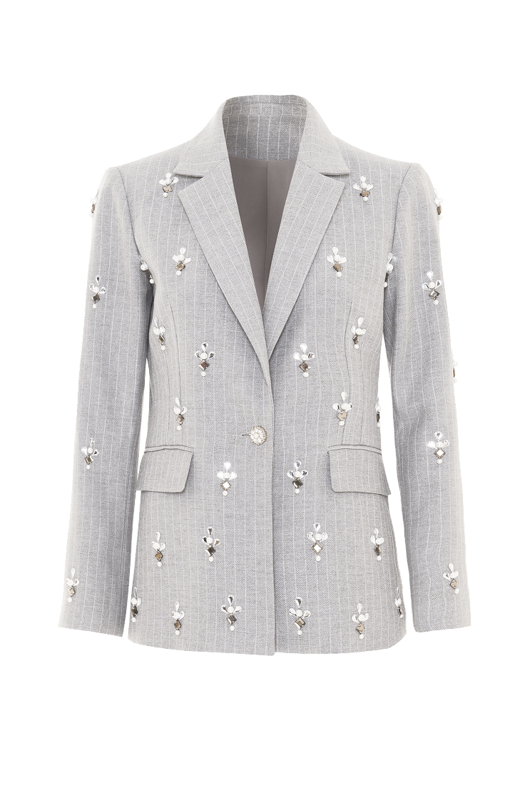 Gray pinstriped blazer with exclusive hand embroidery. It combines structure and sophistication with a subtle touch of shine. Crystals and sequins are hand-applied to create a jewel-like effect, elevating the piece from workwear to evening-ready. Features a slightly cinched waist, flap pockets, and a front closure with a decorative button.