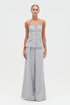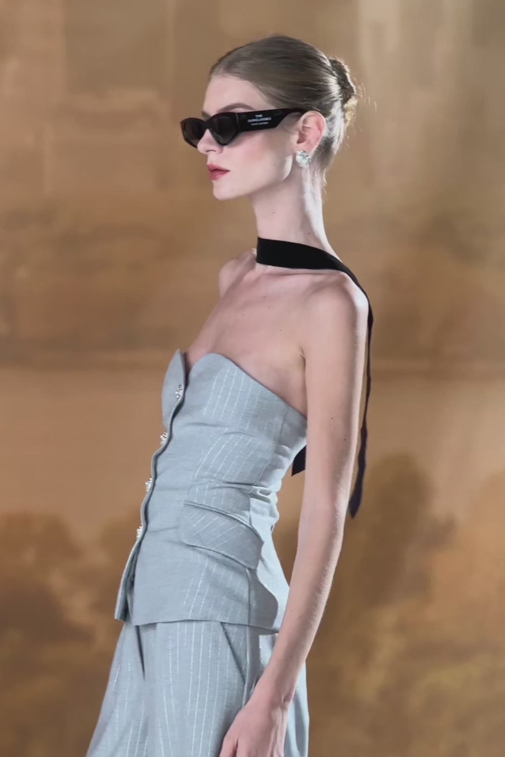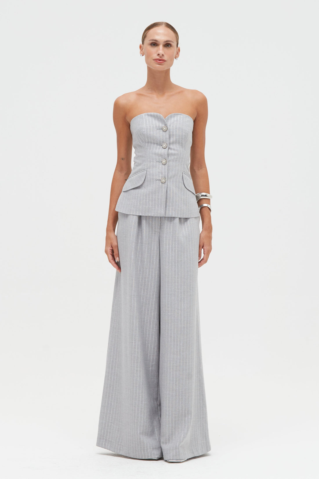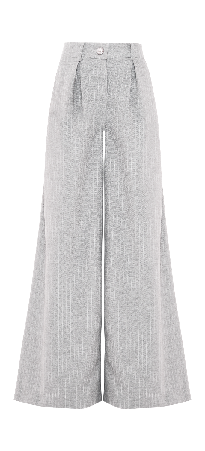 Gray tailored pants featuring a classic pinstripe pattern. This piece combines structure and sophistication with a subtle touch of shine. Designed with a wide-leg silhouette and an elegant drape for a refined finish.