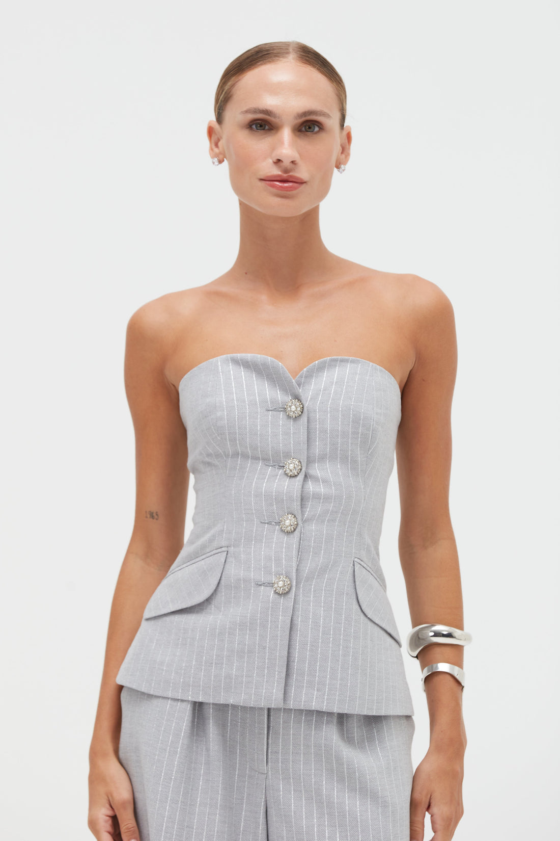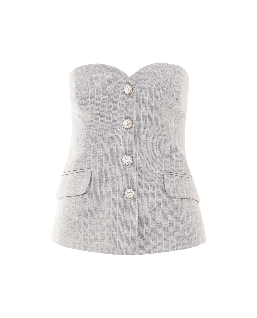 Strapless corset top in classic tailoring brings back the elegance of pinstripes with a modern silhouette. The structured design highlights the waist and bust, while the sweetheart neckline adds a delicate, sensual touch. Crystal buttons bring sophistication to the look, complemented by flap pocket details and impeccable finishing.