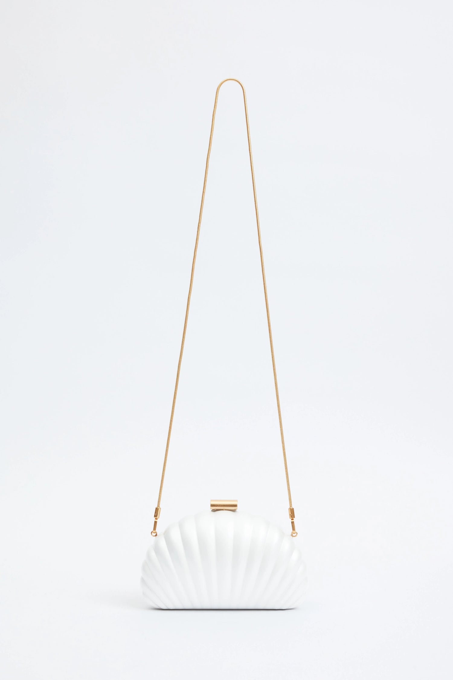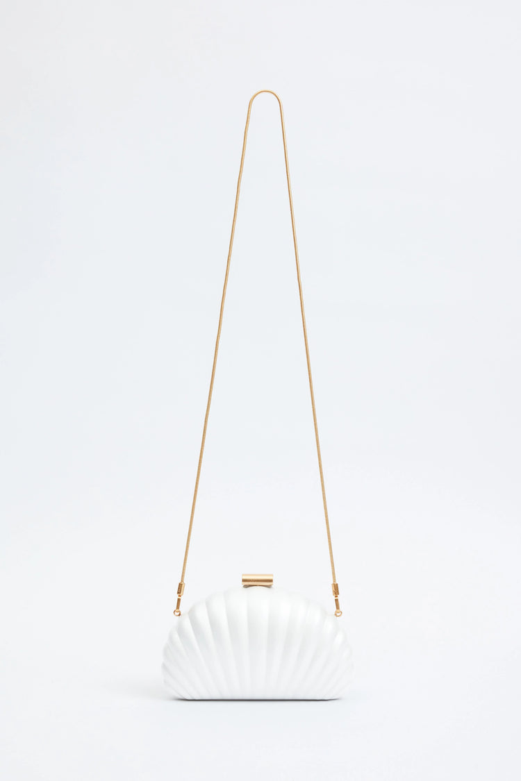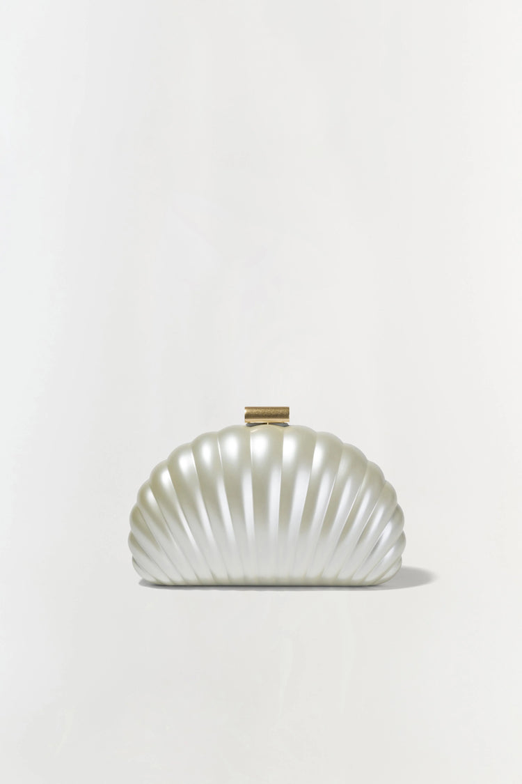 The Monet Clutch in Ivory. Featuring a chic shell silhouette and a subtle pearlescent finish, it’s the perfect accessory for both day and evening looks.