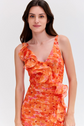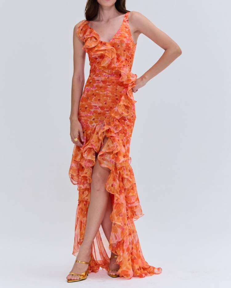 This gown features PatBO's Myosotis print with a fitted bodice and a flutter ruffle detail from the shoulder across the bodice into the slit along the middle of the skirt with a ruffled hemline.