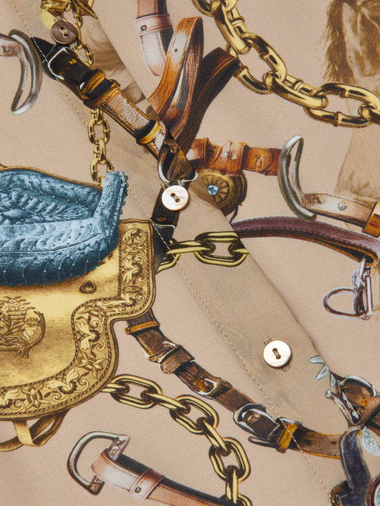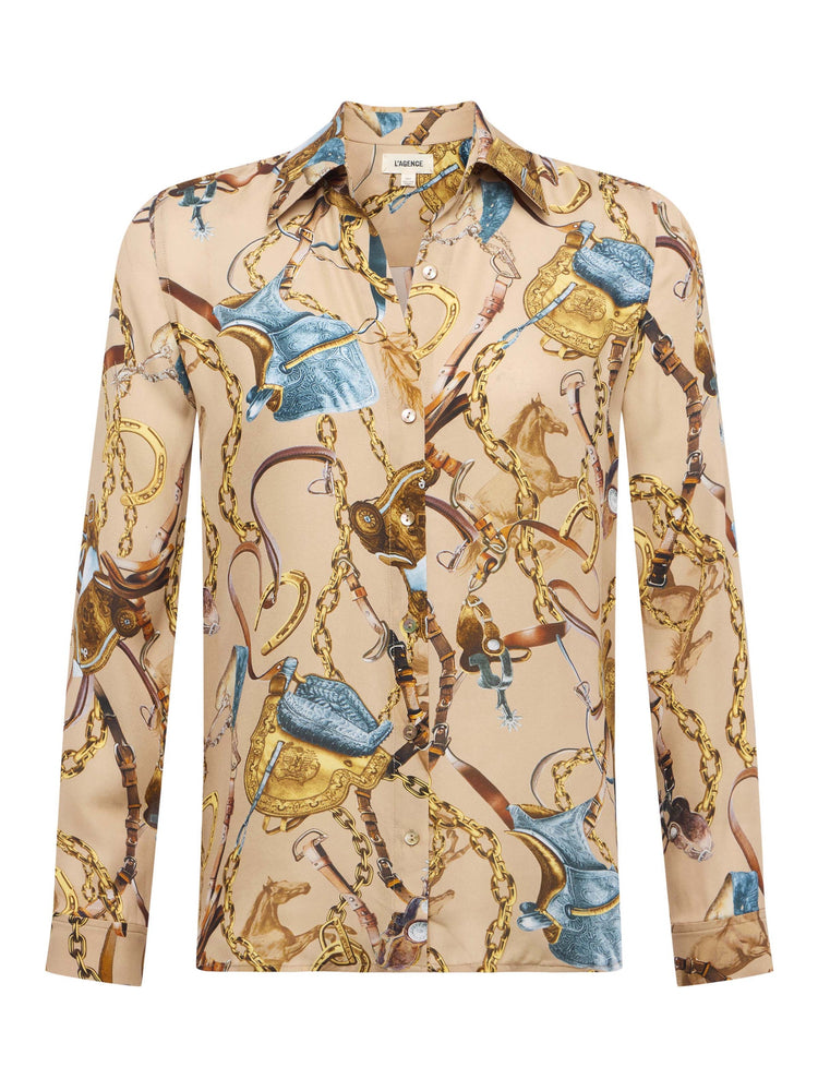 - The Nina is L'AGENCE's classic long-sleeve silk button-down, designed with an easy, relaxed fit. Now back in a chic equestrian saddle print.