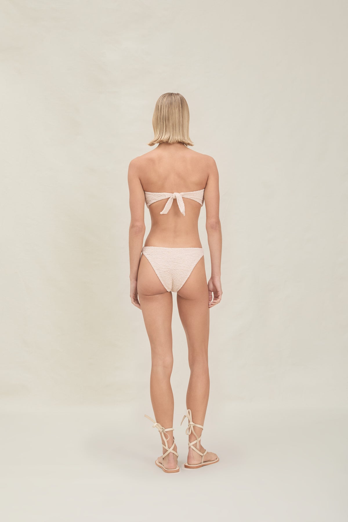 The Noah is a strapless bandeau with an adjustable tie back, removable pads and bead detail at the center-front. Pairs back with the Nina Bottom and Eve Skirt.
