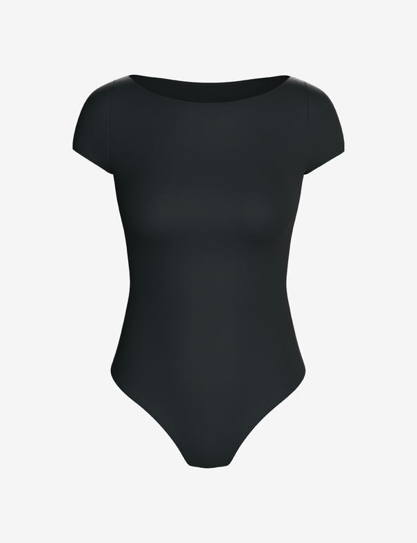 - Boat neck with cap sleeve and thong bottom