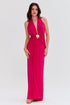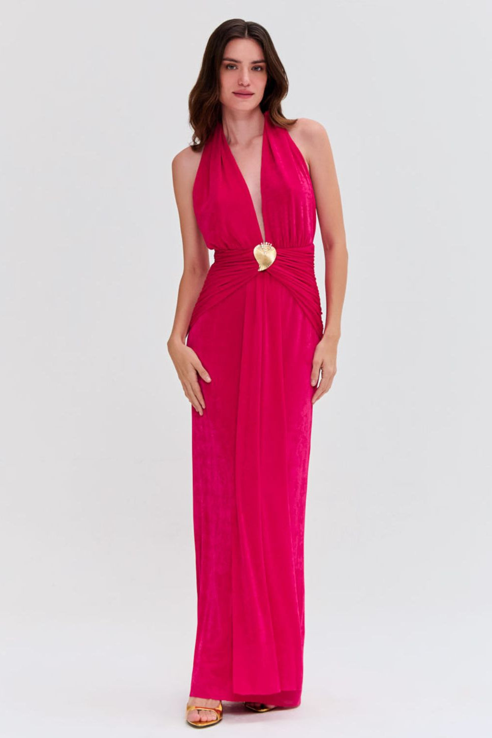 This gown features a plunging halter neckline with ruching detail along the waistline and center special hardware into a flowy full length skirt. Open back design with a tie at the neck and concealed zipper closure. Made in Brazil. 95% Polyester 5% Elastane. VEL31703.