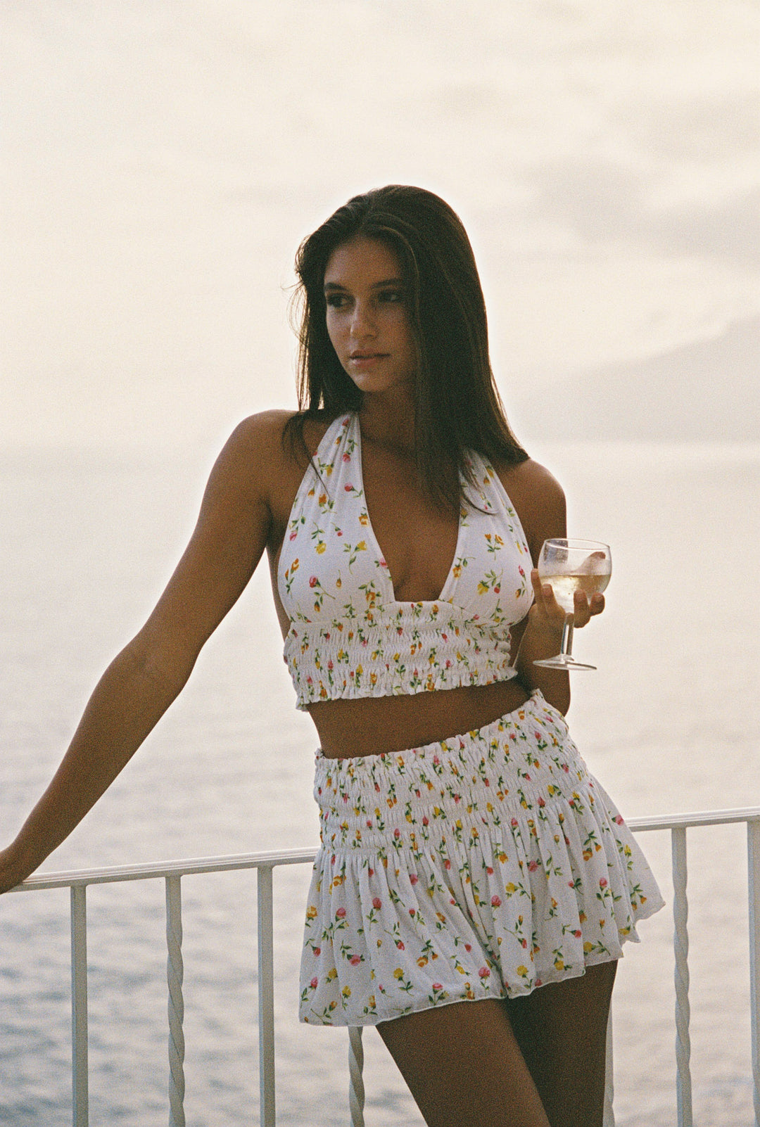 Meet Romeo, the mini skirt half of your new favorite resort ensemble. This soft and stretchy mini features an artfully ruched band and sweet, tiny floral print. Rachelle wears size S.