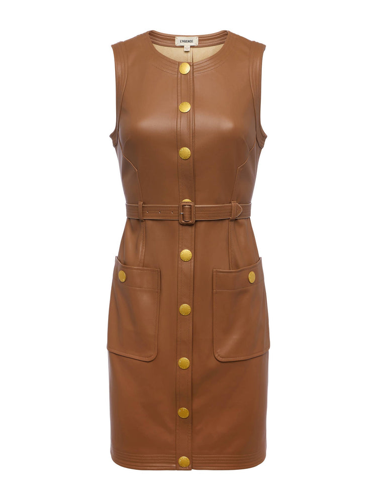 Meet the Ronin dress, crafted from supple stretch vegan leather that fits like a glove and wears like a dream. Now back in soft cognac.