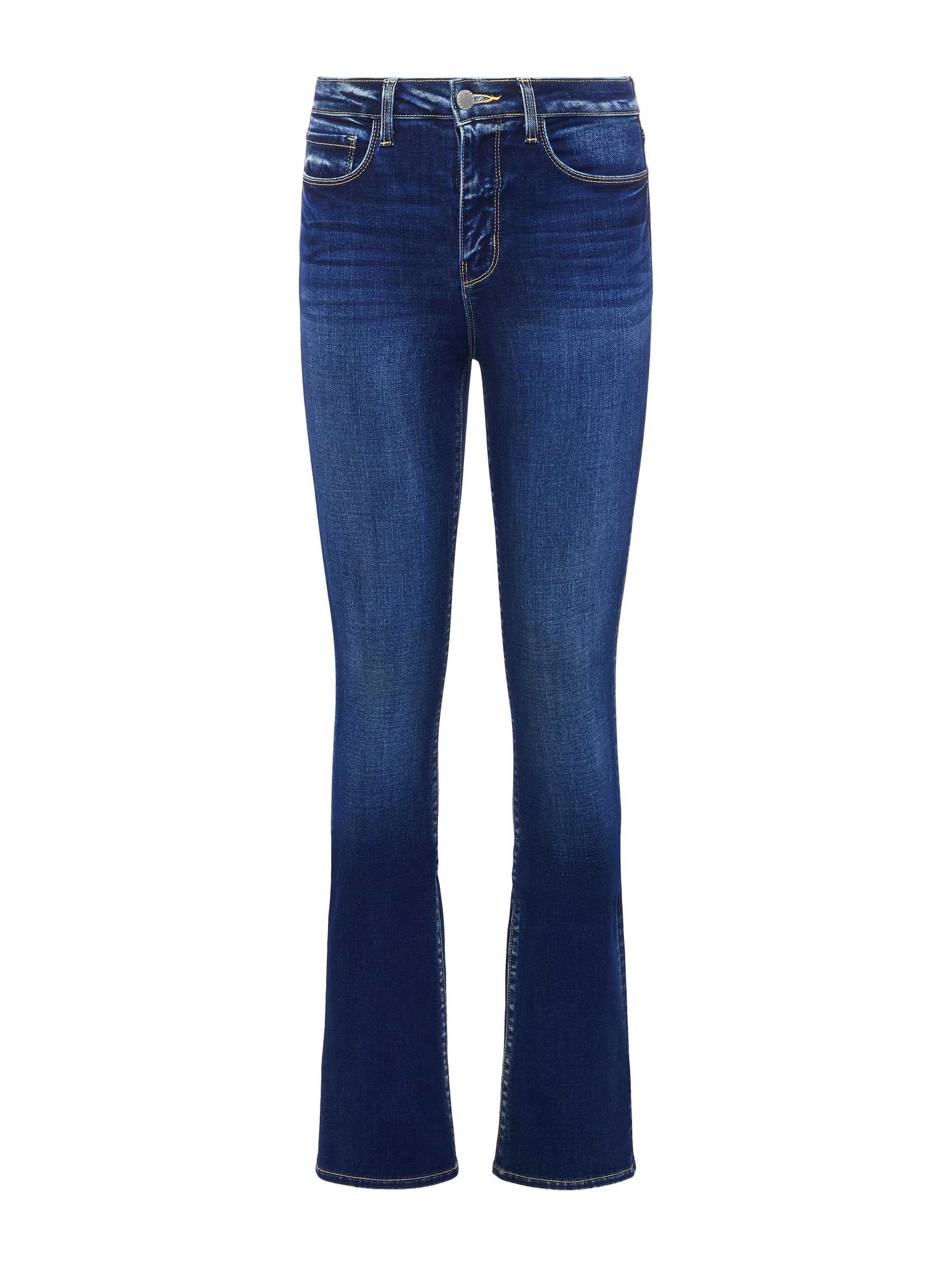A classic high-rise jean in true-blue premium stretch denim that includes REPREVE, a sustainable, high-performance recycled fiber. Meticulous sanding and whiskering enhance fabric's character. Contoured waistband fits securely at the natural waist, then hugs from hip to knee before releasing into a slim bootcut hem. Super-stretch denim holds its shape, smoothing the figure without sacrificing comfort. Contrast topstitching highlights five-pocket construction. Zip fly closure.