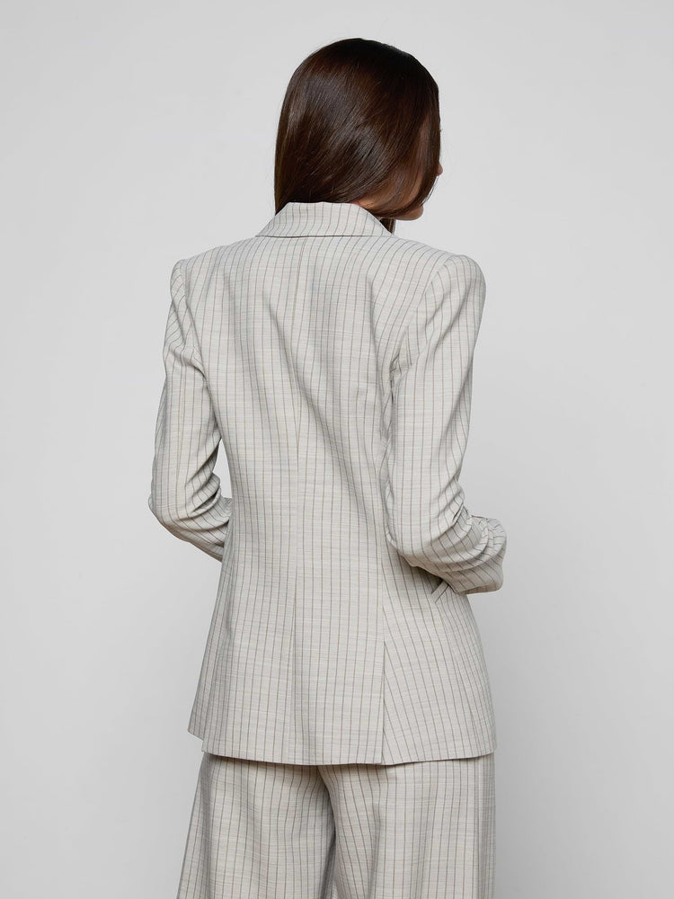 The Sheila single-breasted blazer is back in gray with a sleek tan pinstripe. The long lines of this silhouette are designed to hit below the hip for a streamlined look.