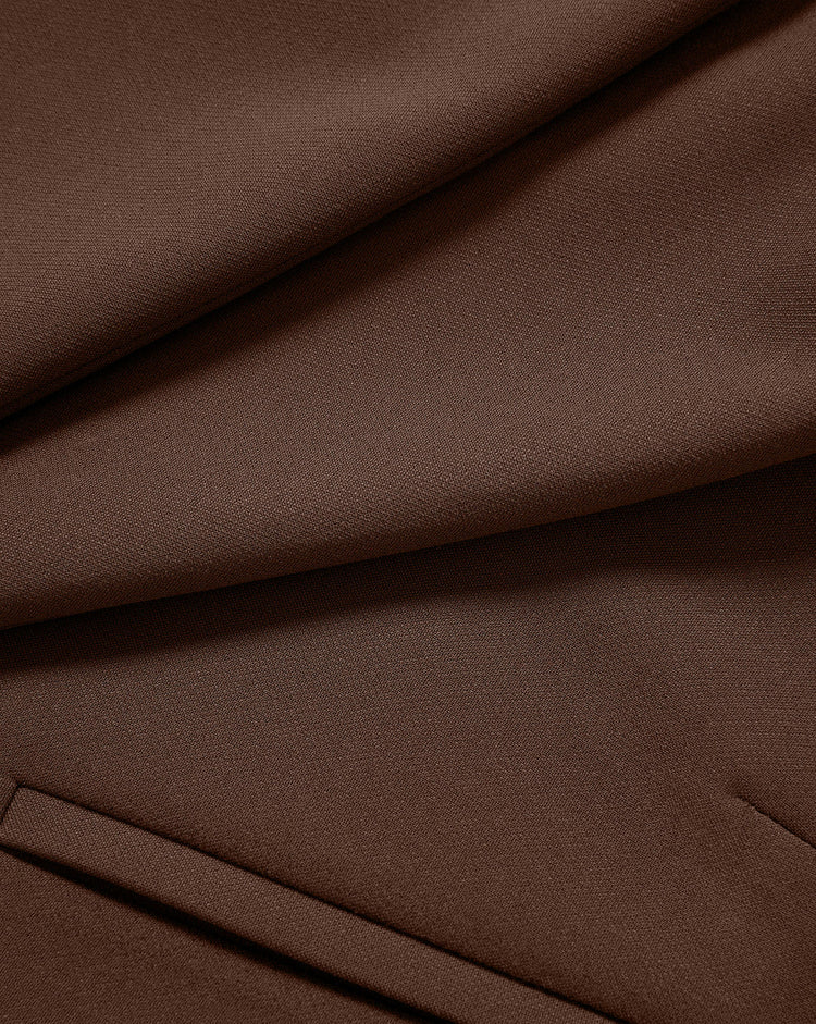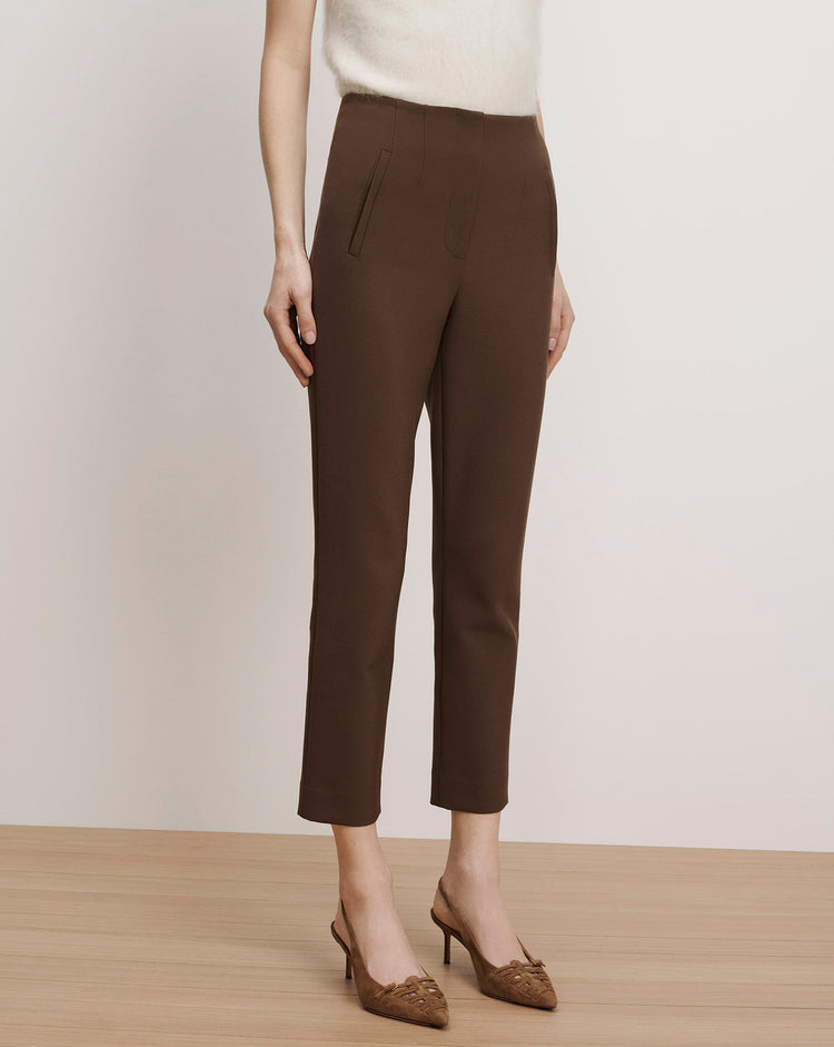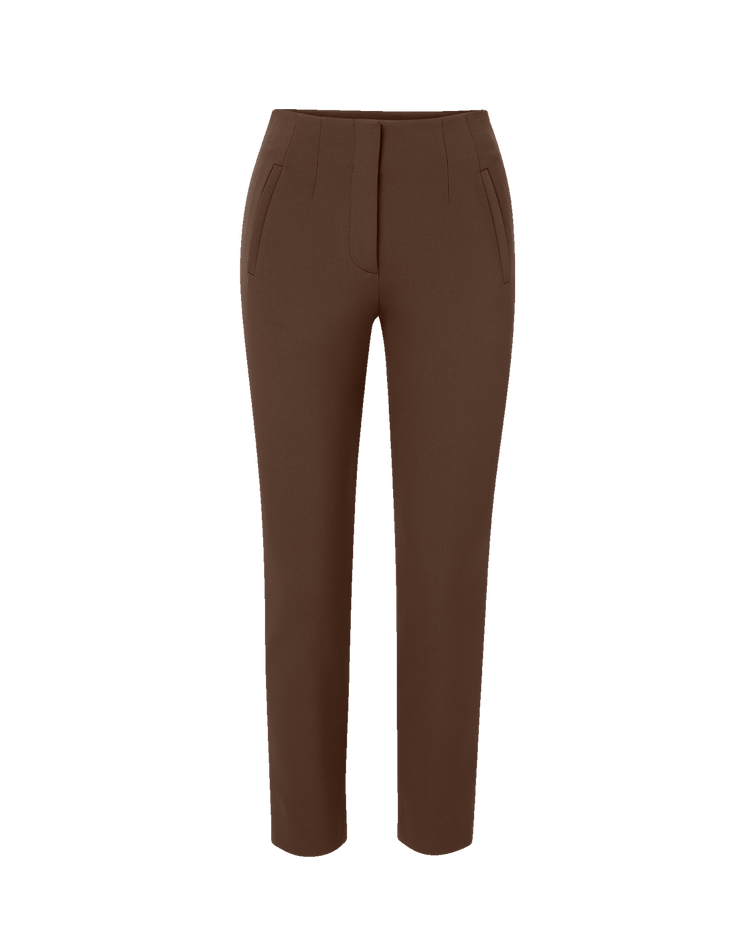 A sleek dress pant with versatility. Expertly tailored in the USA from premium stretch-tailoring blend in rich brown, the Stila's high-rise Hollywood waistband defines, while its slim, straight leg elongates—cropped at the hem to show off your shoes. Welt pockets and a concealed hook-and-bar closure create a clean, streamlined finish. Pair this trouser with the matching Miller for a chic set or a sweater to elevate the everyday.